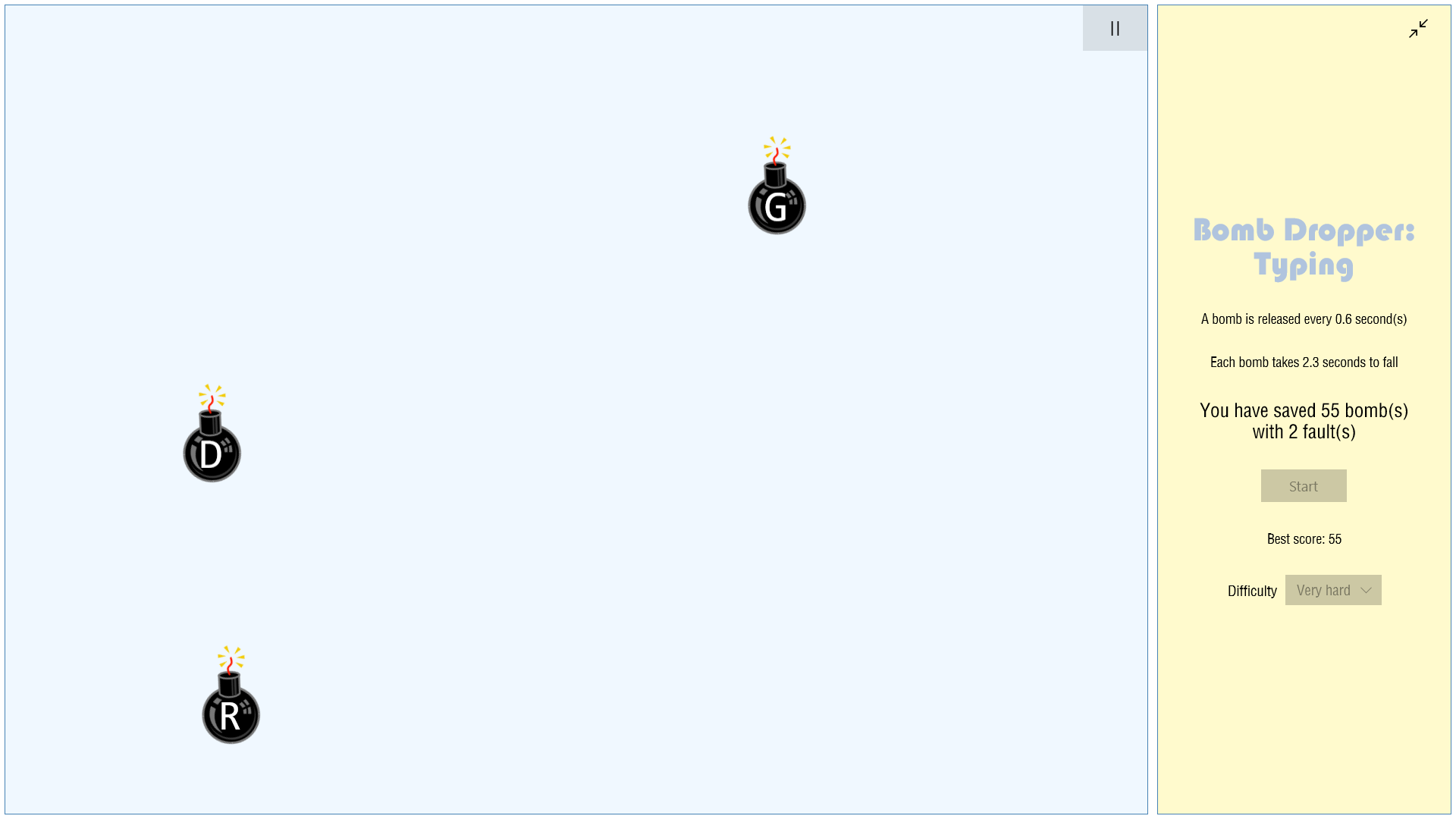 Bomb Dropper: Typing is a game that helps you to practise typing. Bombs with letters on it drop from the top one by one and all you need to do is pressing the relative key to remove it. Once a bomb hit the ground or you pressed a key which has no relative bombs on the screen, you gain a fault. 10 faults will end the game.