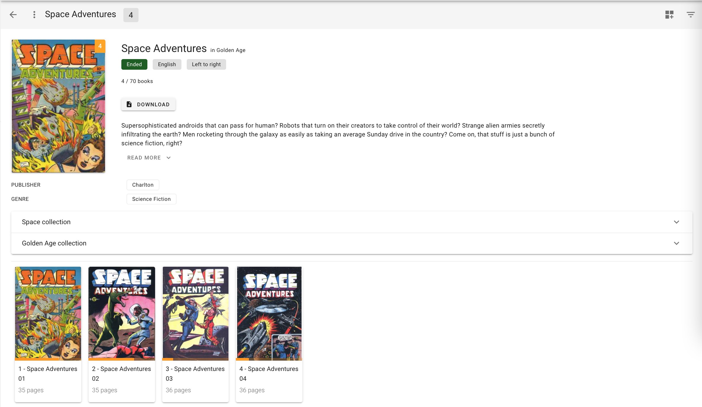 Browse libraries, series and books via a responsive web UI that works on desktop, tablets and phonesOrganize your library with collections and read listsEdit metadata for your series and booksImport embedded metadata automaticallyWebreader with multiple reading modesManage multiple users, with per-library access control, age restrictions, and labels restrictionsOffers a REST API, many community tools and scripts can interact with KomgaDownload book files, whole series, or read listsDuplicate files detectionDuplicate pages detection and removalImport books from outside your libraries directly into your series folderImport ComicRack cbl read lists