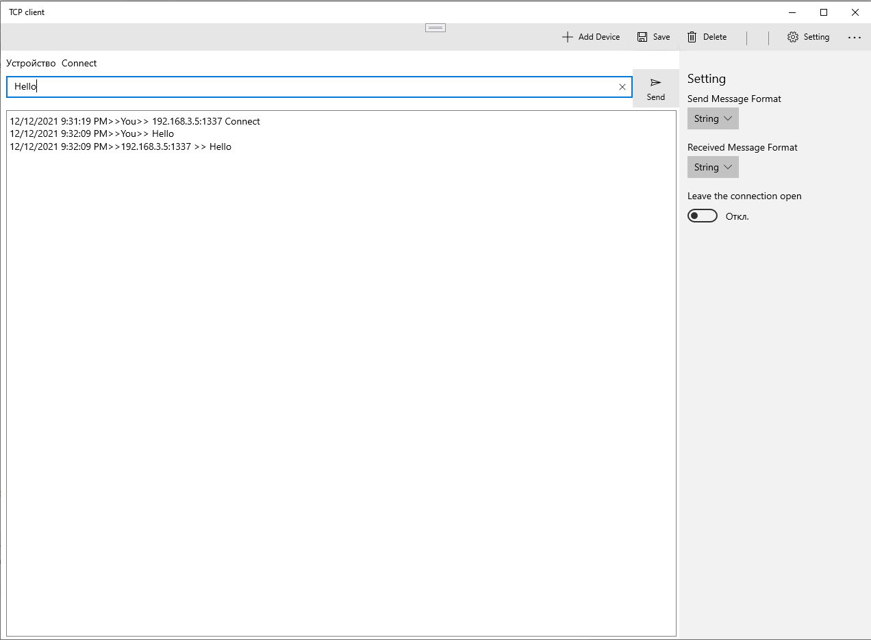 TCP / IP client for connecting to other applications and devicesReceiving data as a string or hexadecimal numberSending data in string or hexadecimal formatSaving application messages to a file