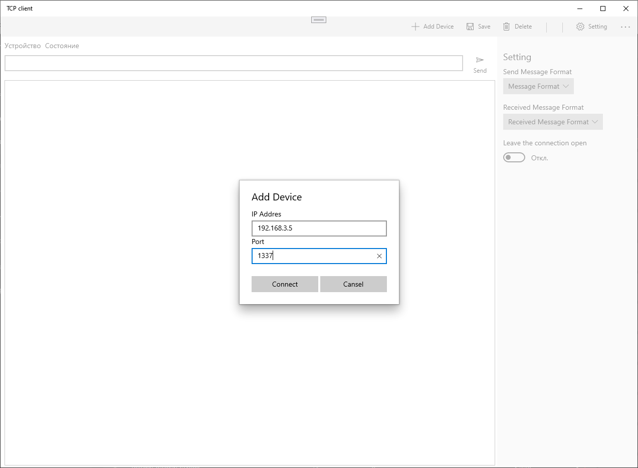 TCP Client Terminal is intended for device developers who need to connect via a local network using an IP address and port to a PC with a server and transmit and read a message as a test string or a number in Hex format (For example, projects with Arduino, computer, smartphone / phone, etc.) ... This application can send and receive messages from the server over the local network, you can use it to debug your devices and applications on windows 10.