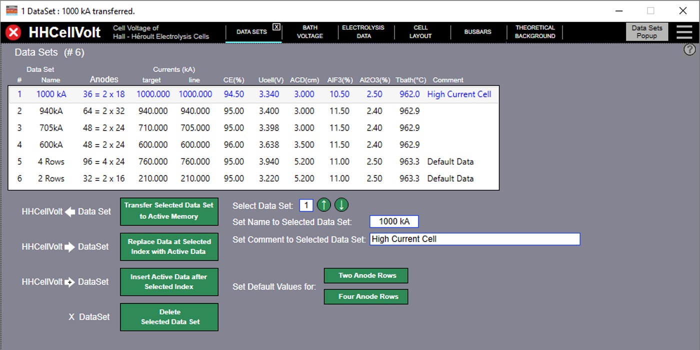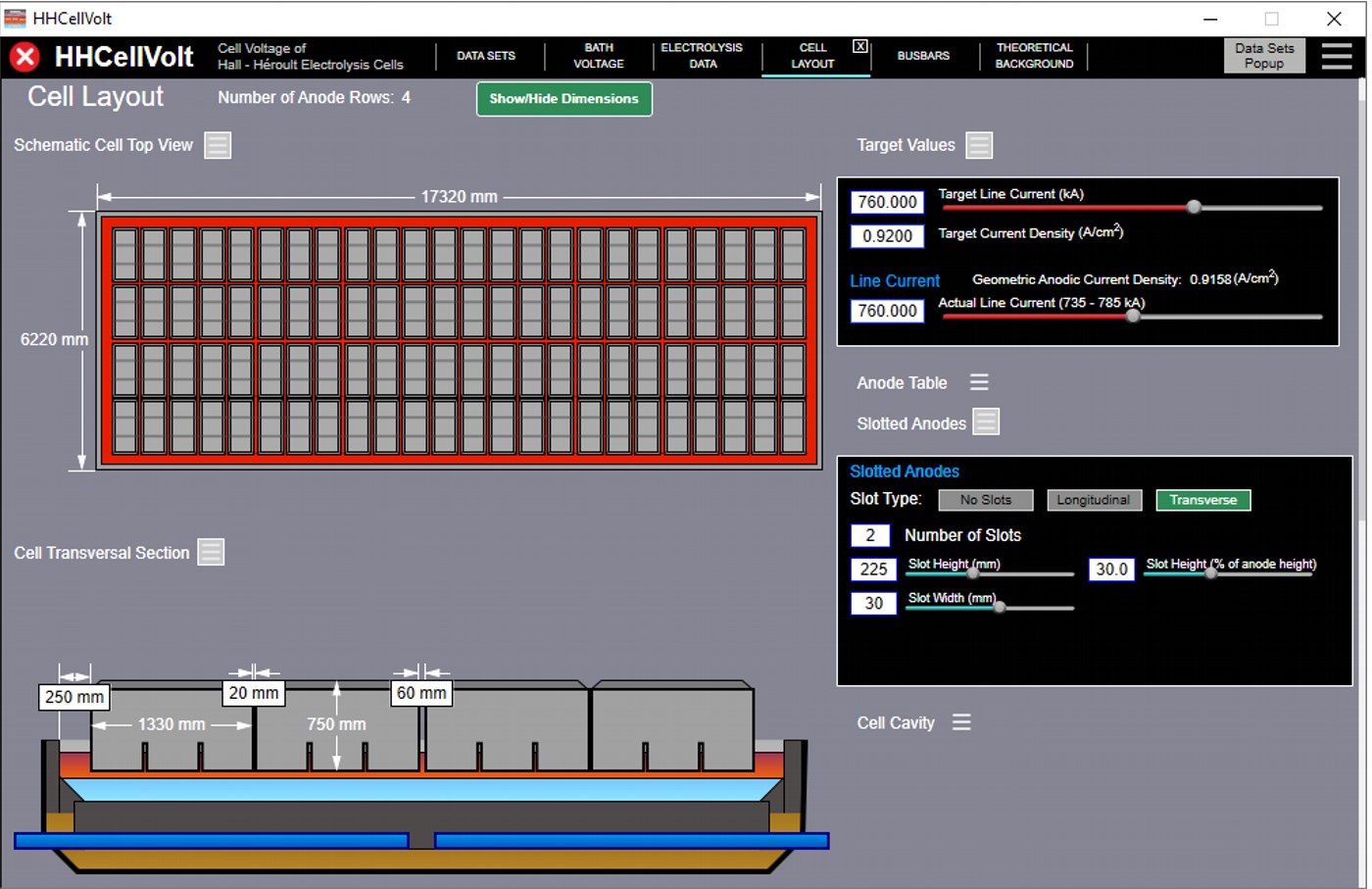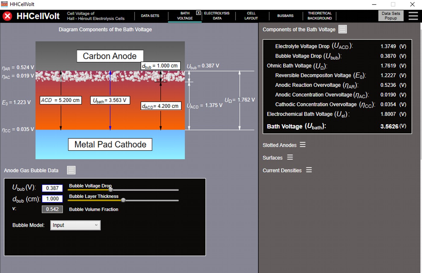 HHCellVoltStd investigates the behaviour of the Cell Voltage of an Electrolysis Cell for Hall-Héroult Aluminum Smelting. This is done in dependence of operational parameter like current intensity, composition of the cryolite electrolyte or cell layout parameters.