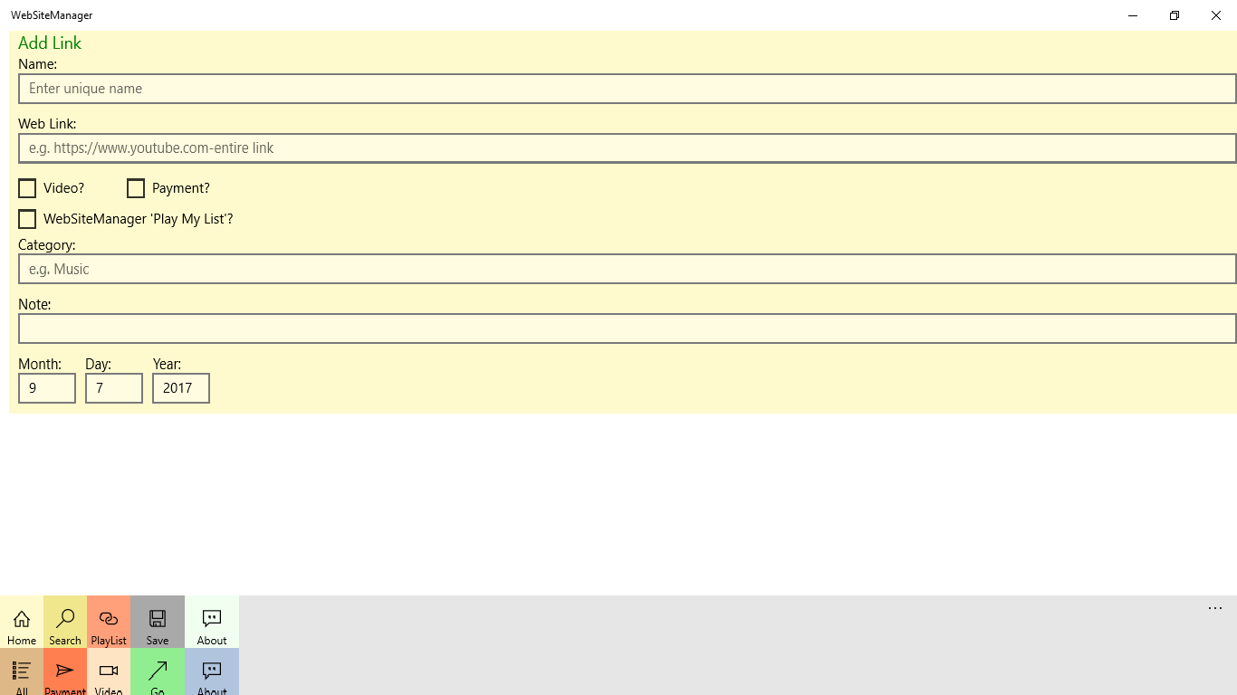 Save web links, few build in WebSiteManager Cortana voice commands including payment and play Youtube video list. You will also get toast notification or live tile payment reminder. Supporting Window 10 Universal Windows Platform (UWP).