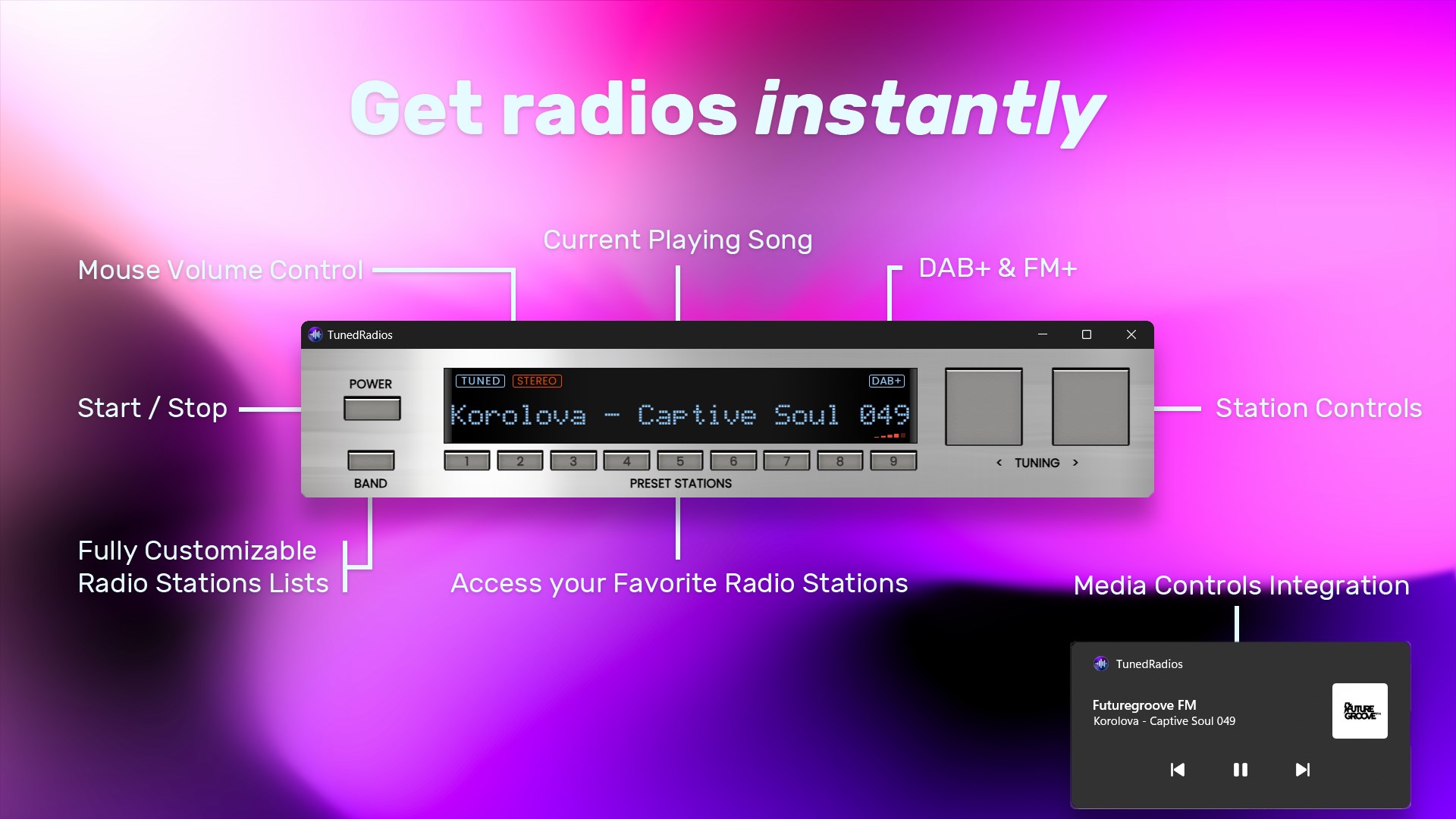 Instant Access to Live Radio Stations of Your ChoiceUnparalleled High Quality Audio Streaming without Interruptions (FLAC)Get Current Playing Song for Every Radio StationFull Windows Media Controls Integration9 Customizable Memory Buttons for Every Band with Cloud Synchronization