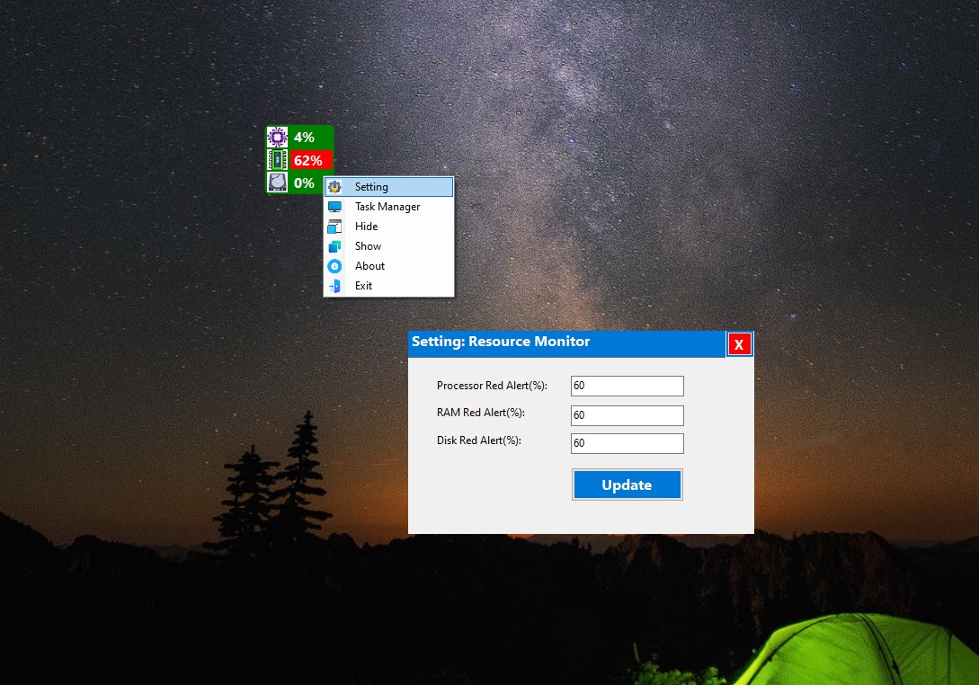 CPU usage percentage in runtime RAM usage percentage in runtime Disk usage percentage in runtimeOS Resource MonitorCPU Monitor