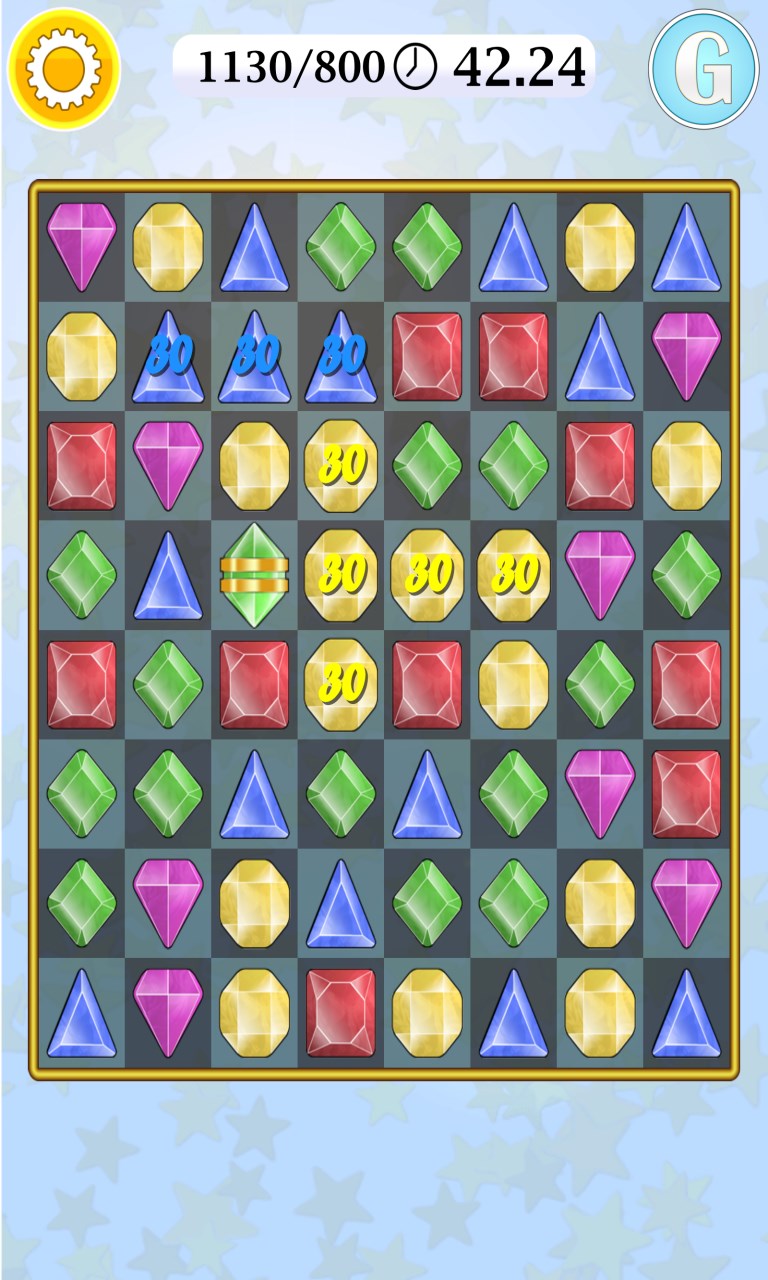 ✓ By matching 4 jewels of the same color in one column, a row buster appears. When matched, clears the entire row it is on.