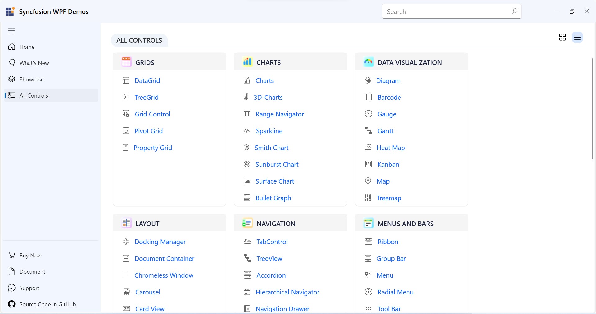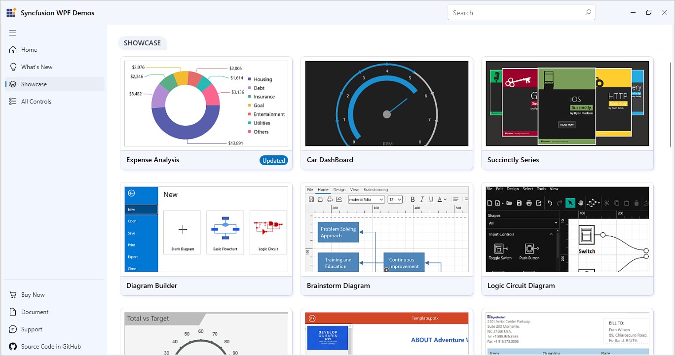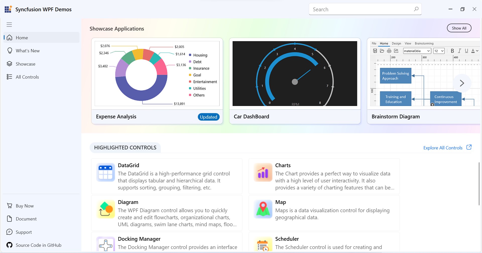 This application showcases the capabilities of controls and file format libraries available in Syncfusion Essential Studio for WPF. The Syncfusion Essential Studio for WPF includes over 95 WPF controls like DataGrid, Charts, Scheduler, Diagram, PDF Viewer, File format libraries, etc. for building line-of-business applications for Windows.