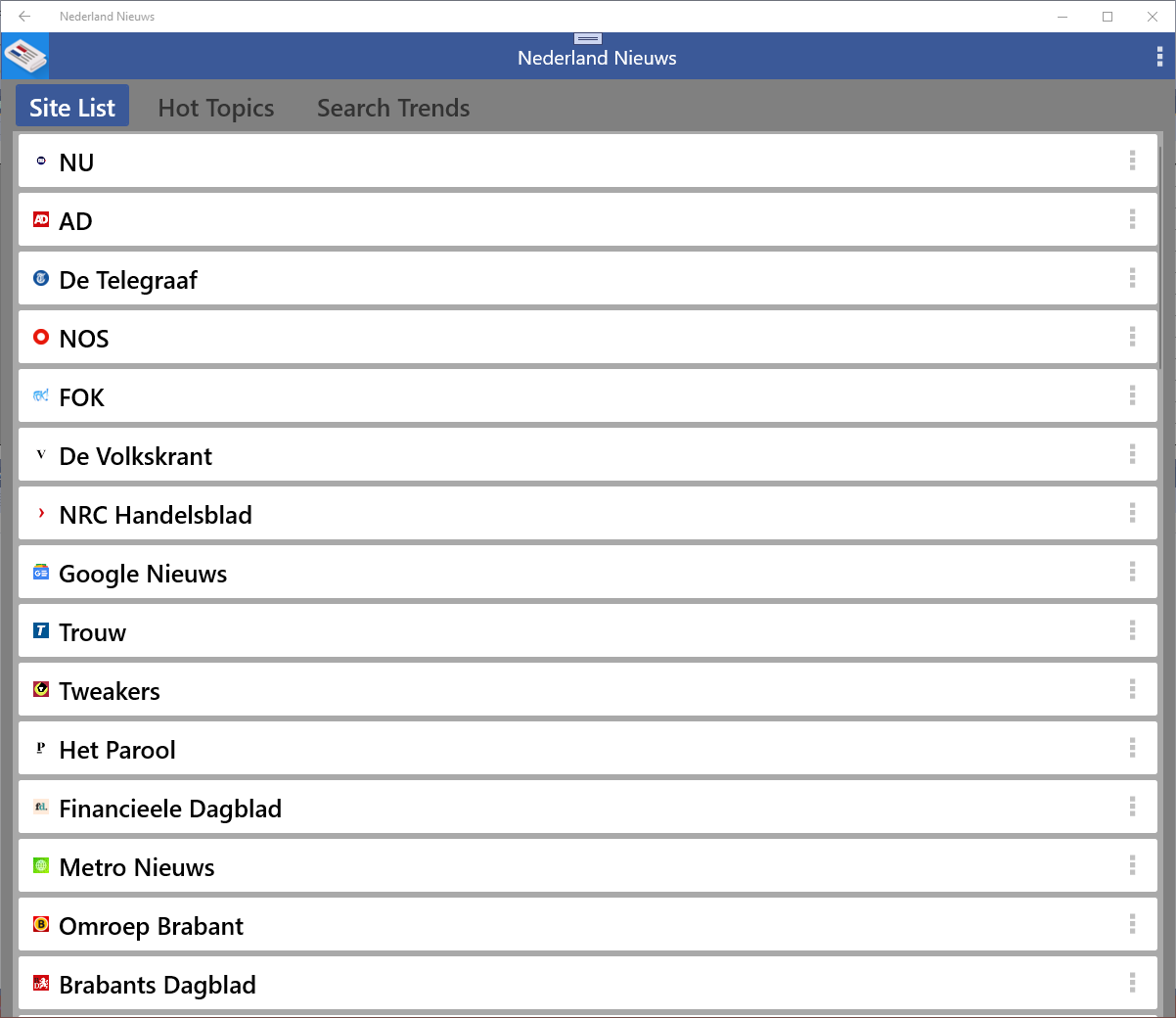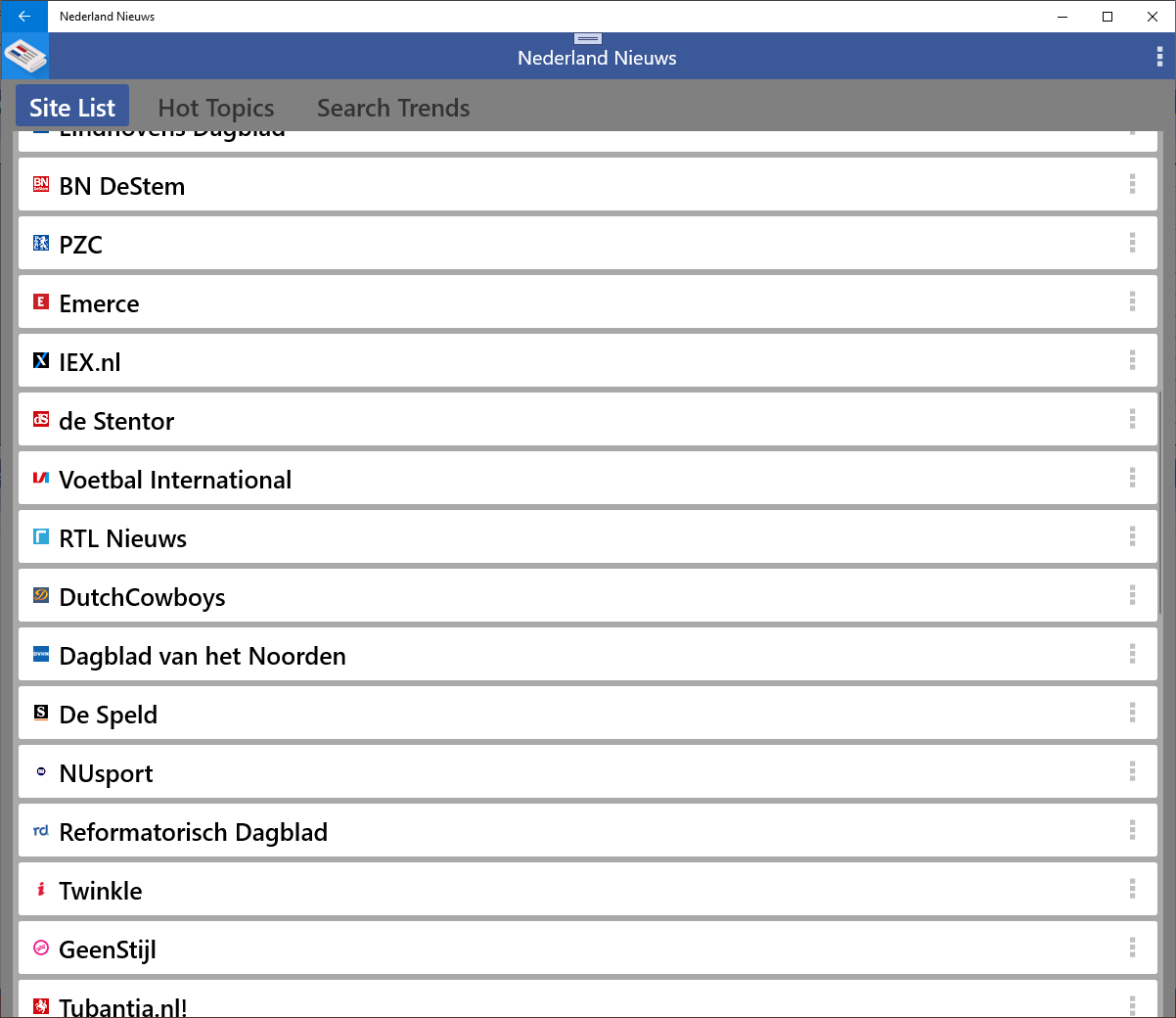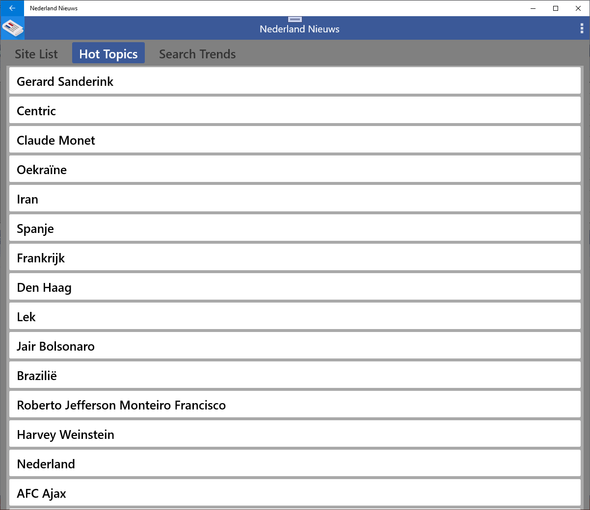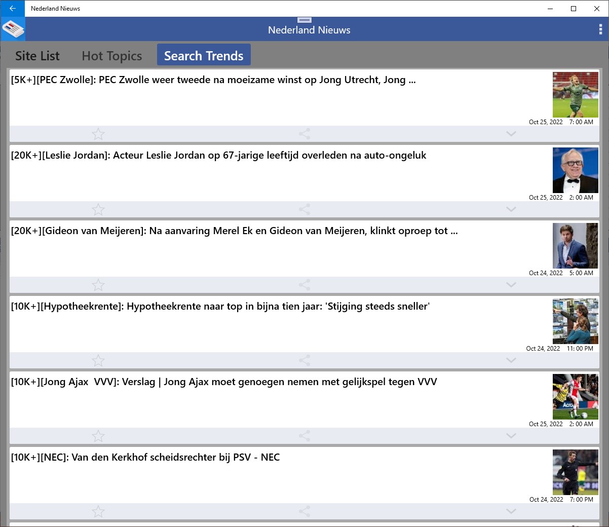 The Hot Topics bring the news presented by list. The search trends show the most searched keywords from the Netherlands.
