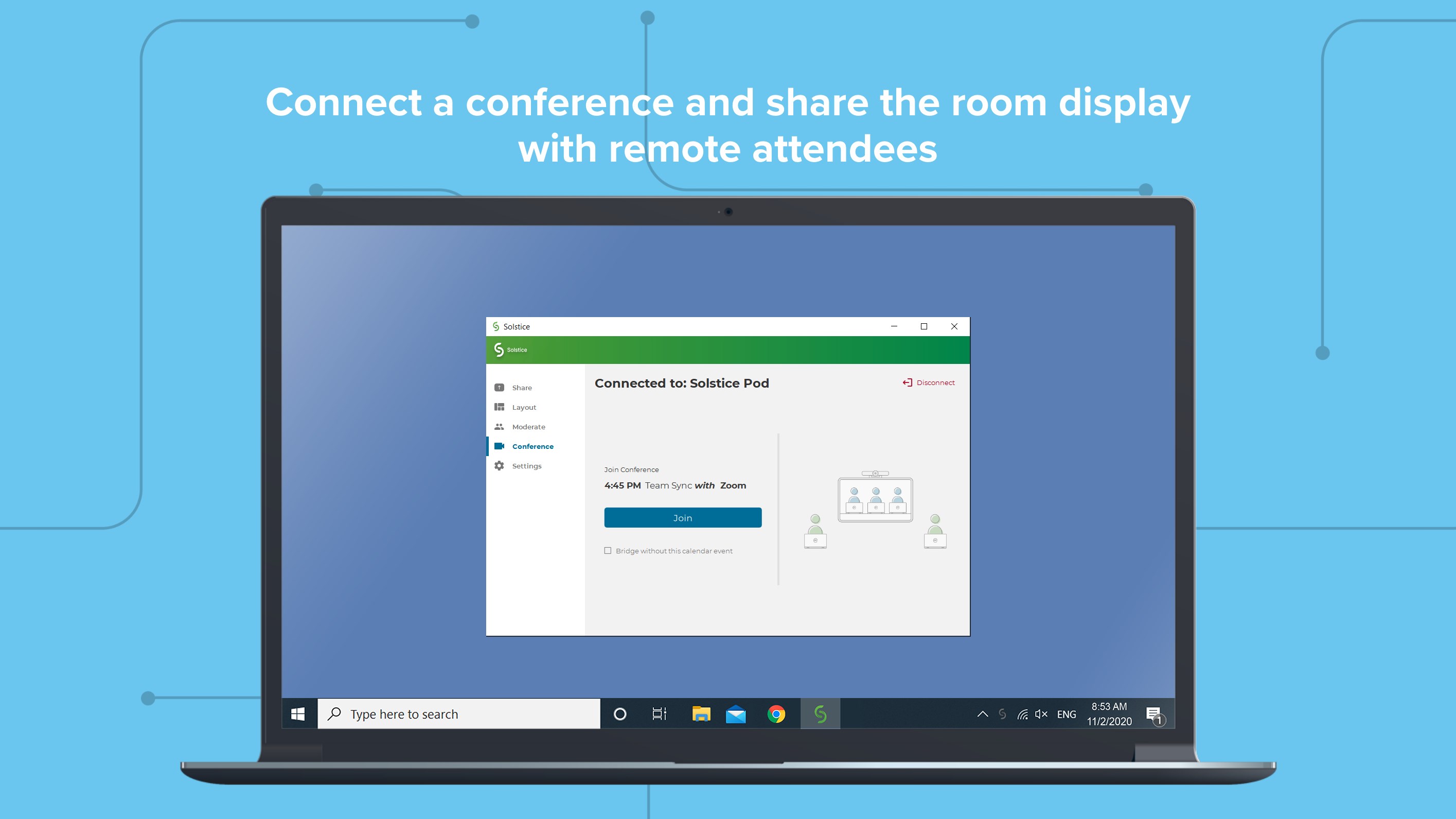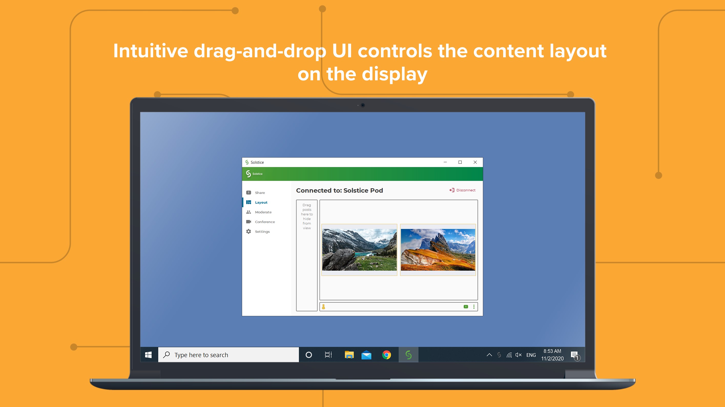 Share your device screen, 4K videos and images, and application or web content such as YouTubeEasy to use drag-and-drop layout controlTouchless annotation and markup using your mobile devicePinch-to-zoom shared content on touch-enabled devicesJoin your web conference from the Solstice-enabled room (supported on laptops only)