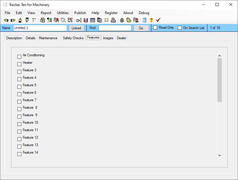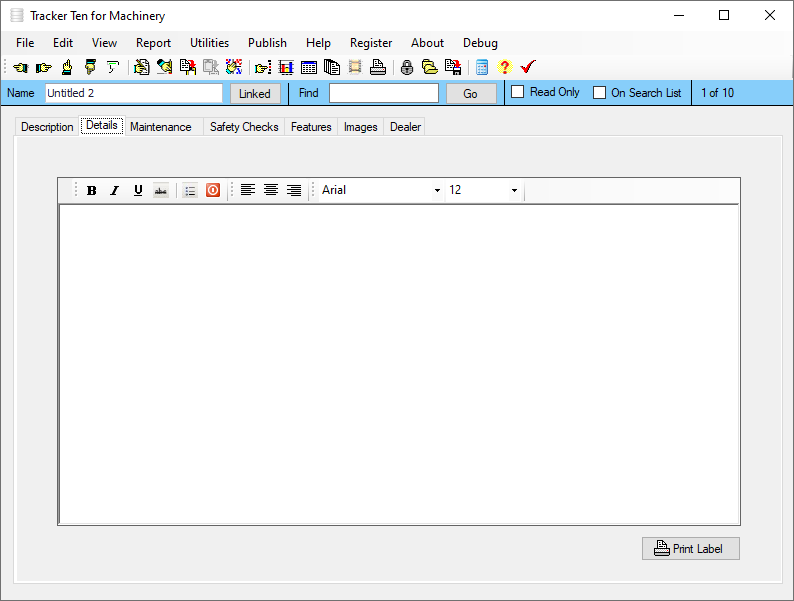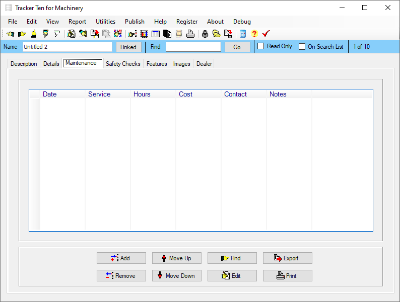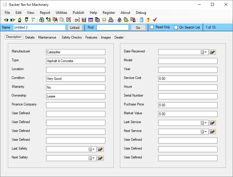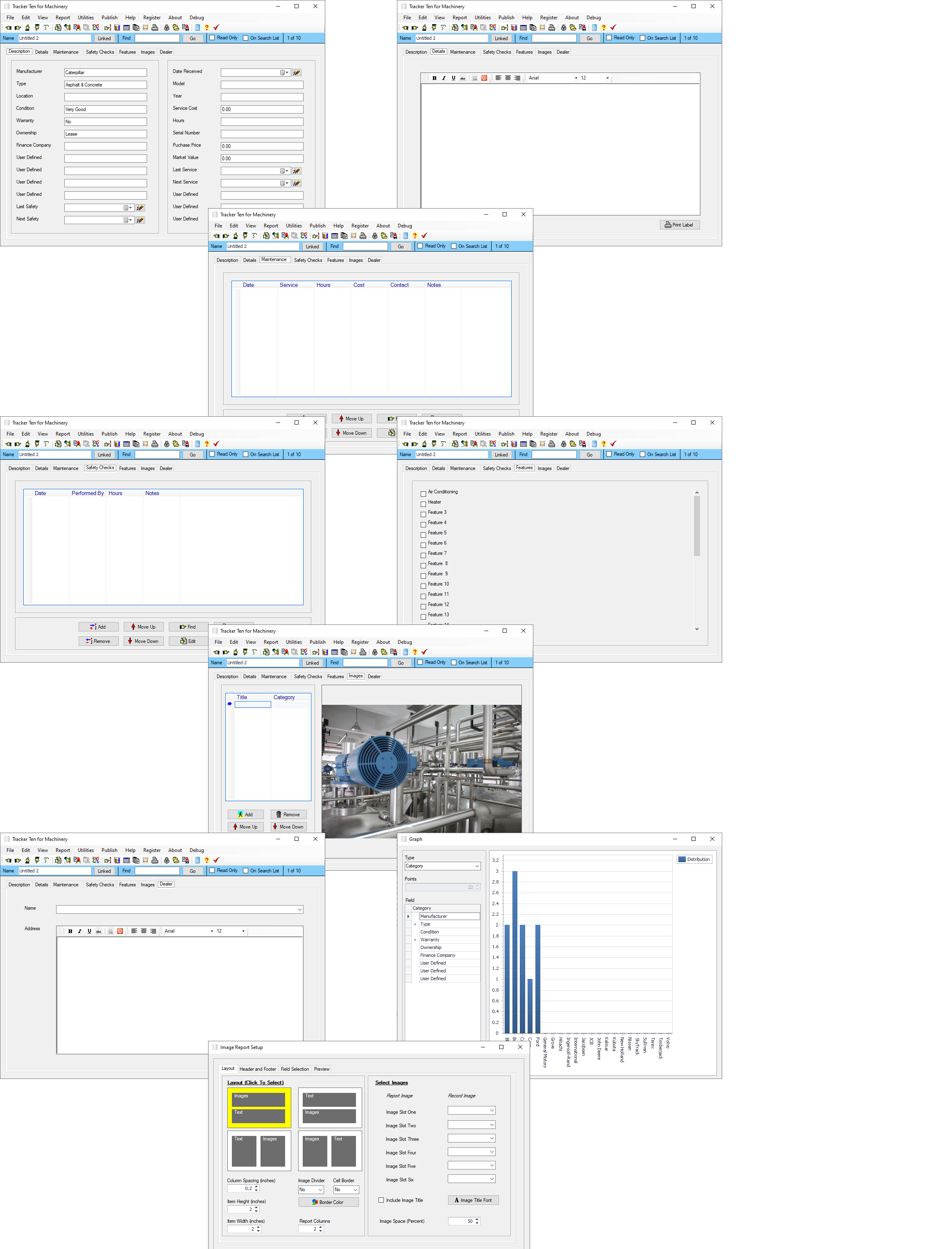 Are you looking for a quick and easy way to keep track of machinery for your business or service? Try Tracker Ten for Machinery! Tracker Ten is all new software, designed specifically for newer versions of windows. It features service history and cost tracking, safety check tracking, image and PDF storage and more! The software includes easy searching and full color reporting with customizable fields that can be setup for any time of application. You can also quickly generate reports showing upcoming service dates and safety checks.