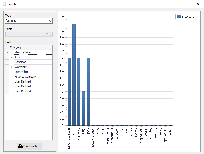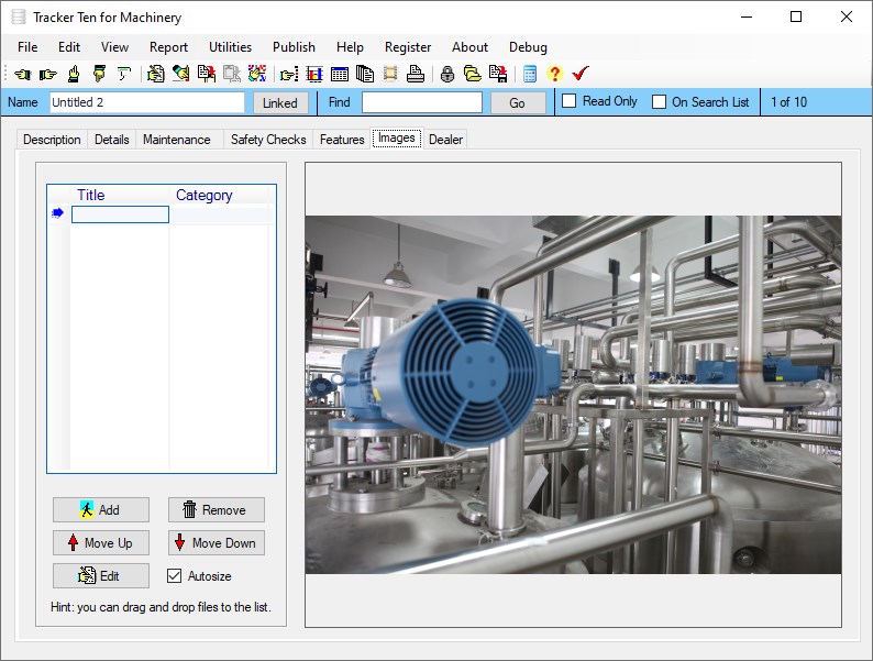 Sample fields include manufacturer, type, location, condition, warranty, ownership, finance company, last safety, next safety, date received, model, year, service cost, hours, serial number and more.Keep track of last service date and upcoming service dates.Keep track of safety inspections.Works for Material Handing equipment: Elevators, Moving stairways, Conveyors, Stacker MachineryWorks for production machinery including textiles, semiconductors, plastics, rubber & food processingOnline help file.Numerous user defined fields so you can setup the software to suit your exact needs.Number and Date reports showing upcoming reminders.Rich text format notes areas for details and notes.30 Customizable feature tracking check boxes.Dealer name and contact information tracking area.Advanced multi-level nested item categorization system.Quick and Easy Data Entry with Customizable Pull Down Menus.Powerful Data Sorting and Filtering.Simple and easy cut, copy, insert and record navigation functions.Multiple Image Support (up to 100 pictures for each record !). All major image types are supported (i.e. bmp, jpg, gif, png etc.).Easily incorporate pictures from your Digital Camera or Scanner. Also attach and view PDF equipment manual files in Image area.Full color image reports.Powerful and Intuitive Search Functions that let you quickly and easily retrieve the data you need Comma delimited data import.Multiple Data Views Including Spreadsheet, Album View (allowing you to visually view different items in your inventory side by side) and 3-dimensional full color Graphs showing inventory breakdown.