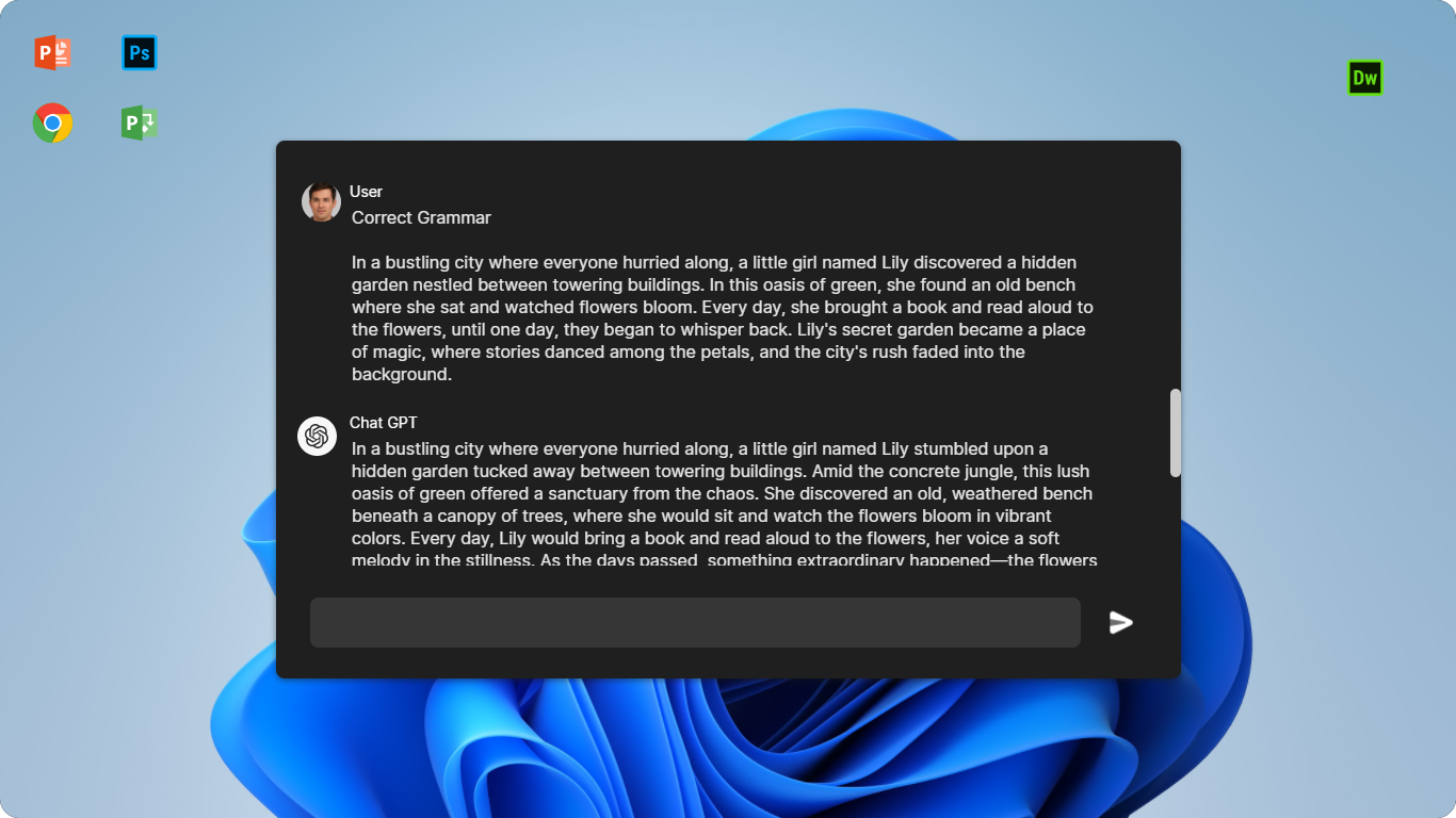 A simple floating widget allows you to access the AI assistant immediately from anywhere in your workspace. It is simple and clean, designed to give you the power of AI instantly without disrupting your workflow.