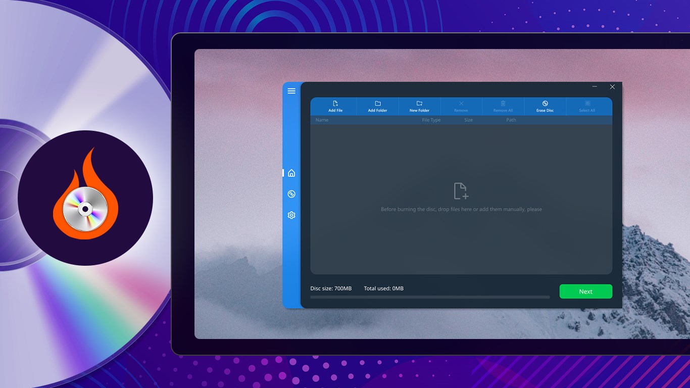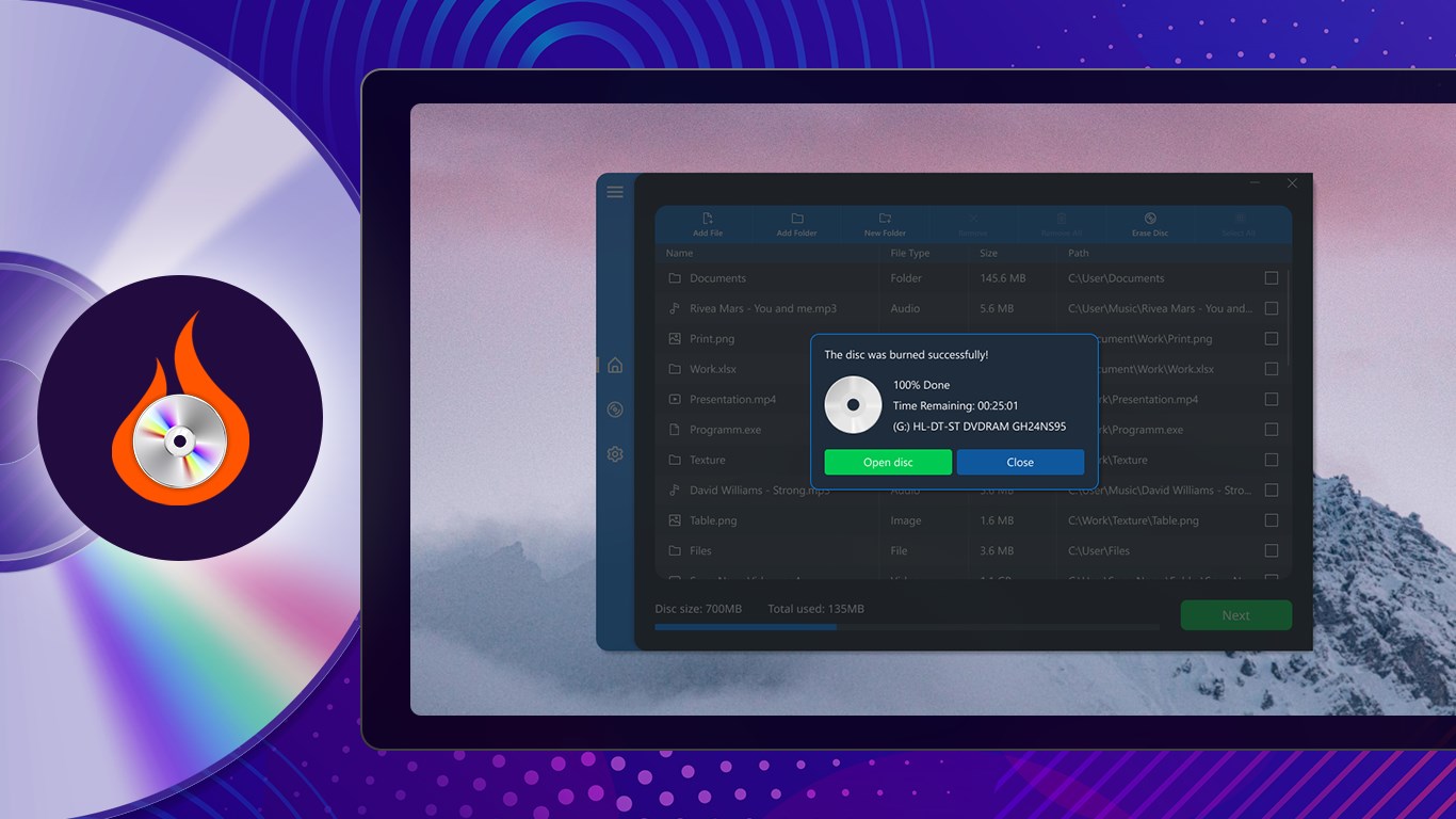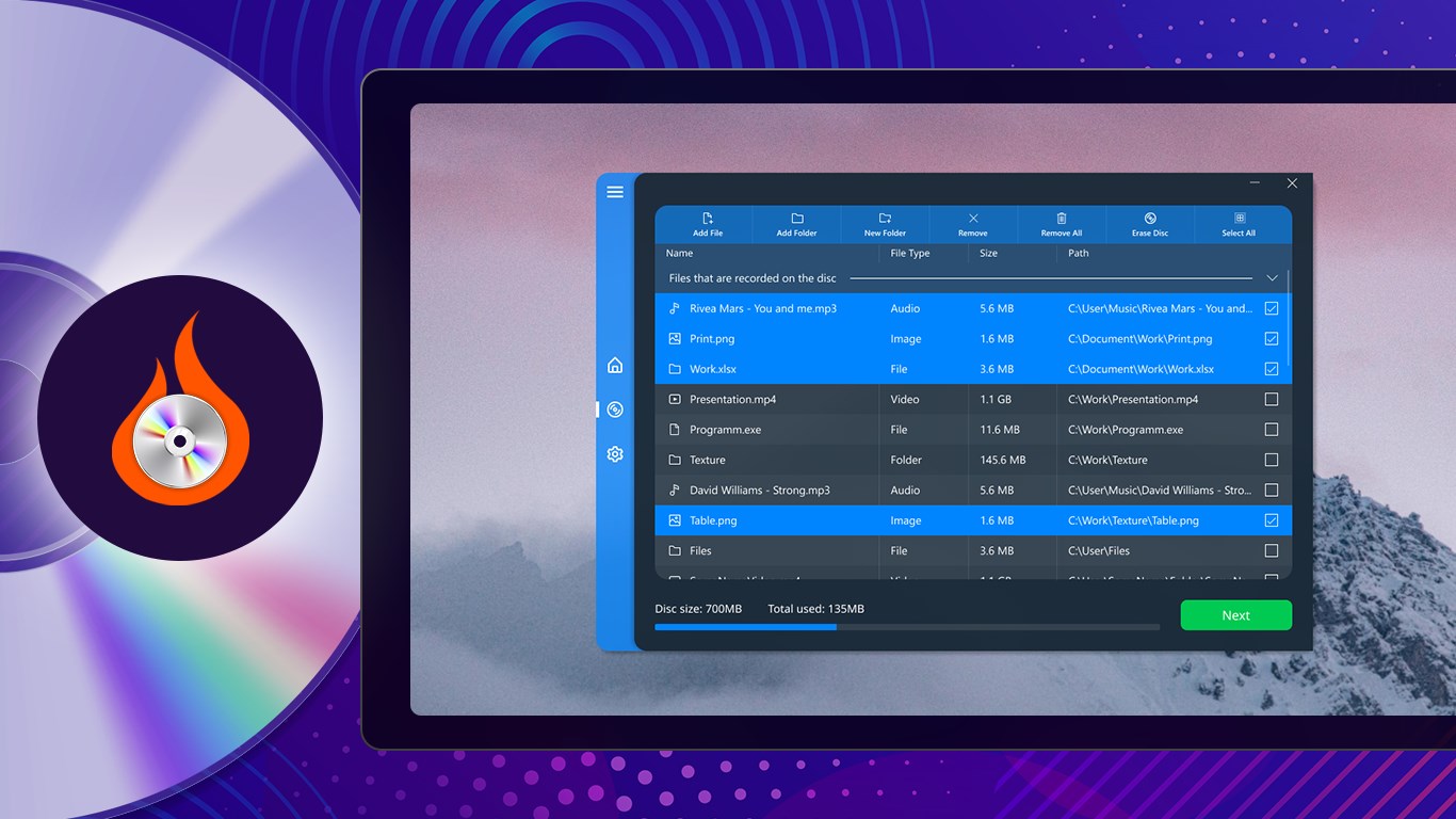 Burn Disk CD DVD Blu-ray is a convenient tool for creating CDs, DVDs, and Blu-ray discs from all kinds of files on your computer as quickly and easily as possible.
