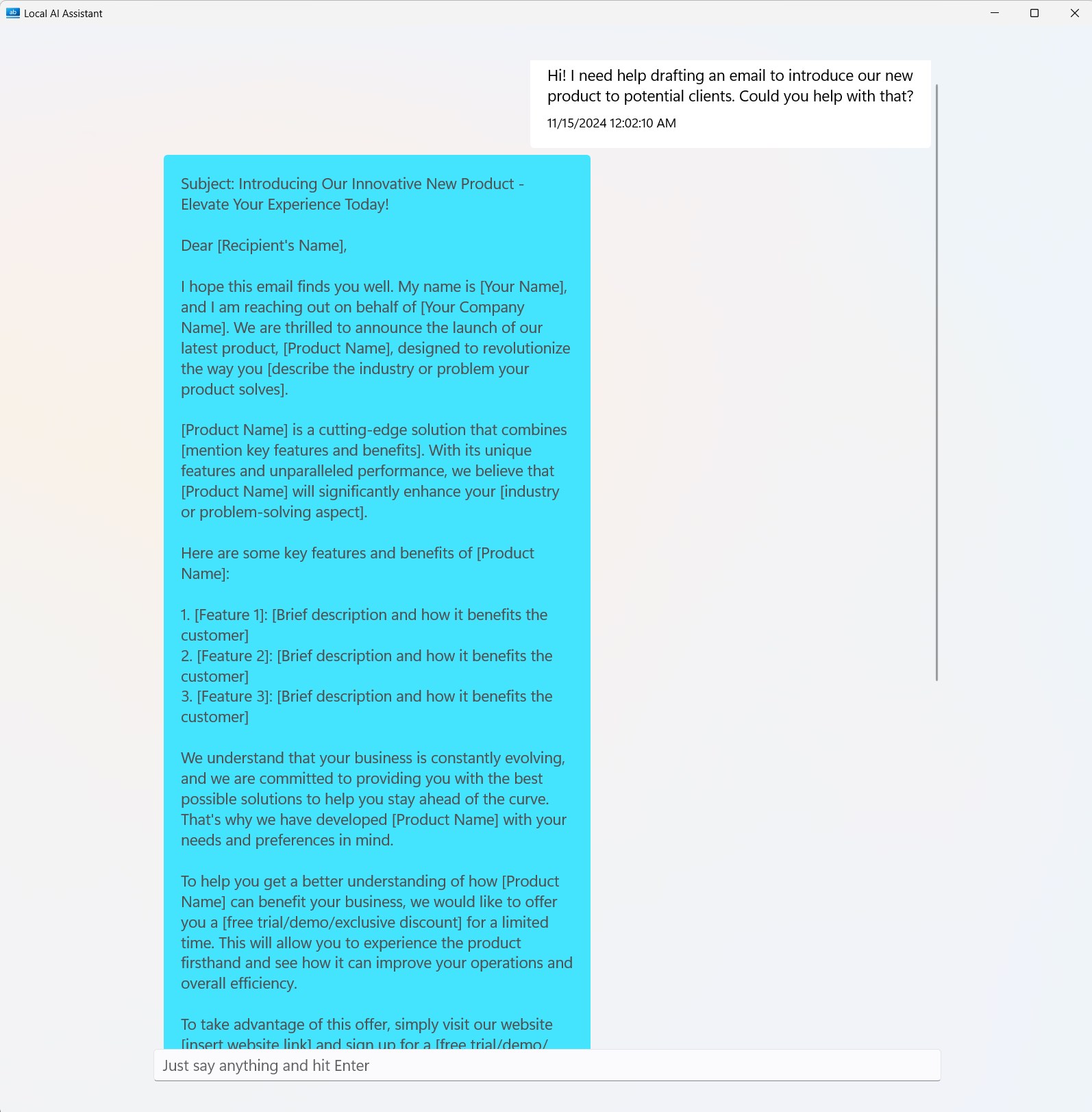 Local AI Assistant is an advanced, offline chatbot designed to bring AI-powered conversations and assistance directly to your desktop without needing an internet connection. Installed and run locally on Windows (requires Microsoft .Net Desktop Runtime and Microsoft VC++ Runtime, both downloadable free), this app provides a fully self-contained AI experience, ensuring total privacy and data security by keeping all interactions on your device. Built for businesses, students, and individual users alike, LocalGPT is ideal for generating insights, ideas, or engaging in natural language interactions without worrying about data privacy or network requirements.