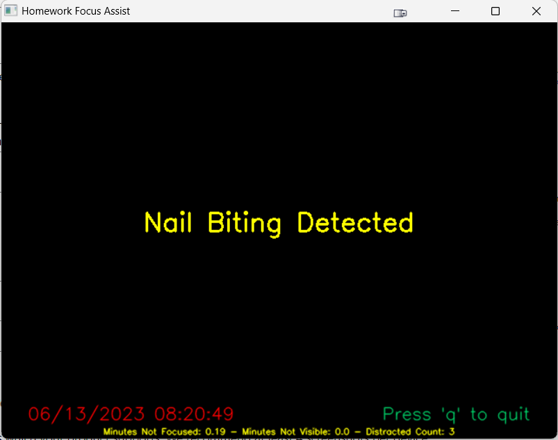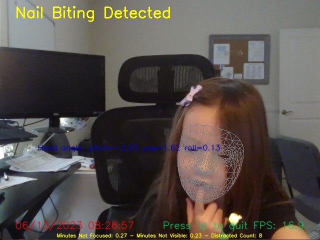 - Bad Habit Detection: Ever found yourself biting nails, picking your nose, or fiddling with your hair while working or studying? Our application identifies these habits and nudges you to stop, helping you cultivate better concentration and hygiene habits.