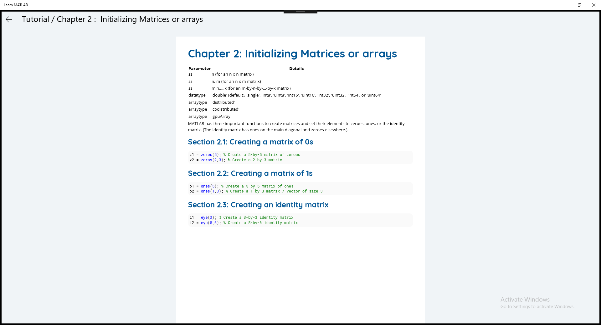 Chapter 2: Initializing Matrices or arrays