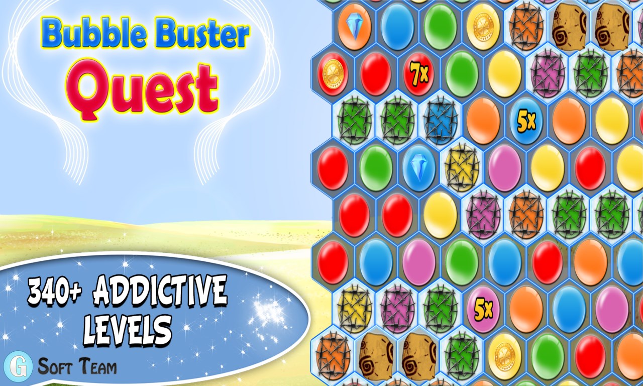 340+ hand-crafted levels, each one unique and filled with amazing challenges;2 types of levels: levels with limited moves and levels with a time limit;2 game objectives: achieve the target score and break all diamond and crystal cells;Multipliers, silver coins, golden coins and diamonds placed above the bubbles which will help you get more points;3 types of obstacles: stones, rocks and bars;HD quality graphics that will look great on your phone and tablet;Addictive, suitably challenging as you move up through the levels;✓ Bubble Buster Quest is completely free to play. You can complete all levels without making a single purchase. However, if you want to speed up your progress, you can make in-app purchases to get ext