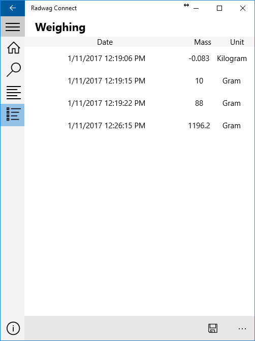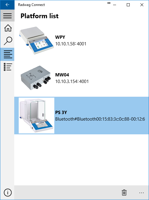 Connecting to all devices using RADWAG\’s Common Communication Protocol, Communication via local networkSupports taking weight, zeroing the device, and tarring itAutomatic search for devices in your local networkCommunication with a few devices at the same timeList of connected platforms (scales and balances)History of taken measurementsExporting measurements into CSV filesWorks with any Windows 10 device: PCs, laptops, tablets and smartphonesSupported languages: English and Polish