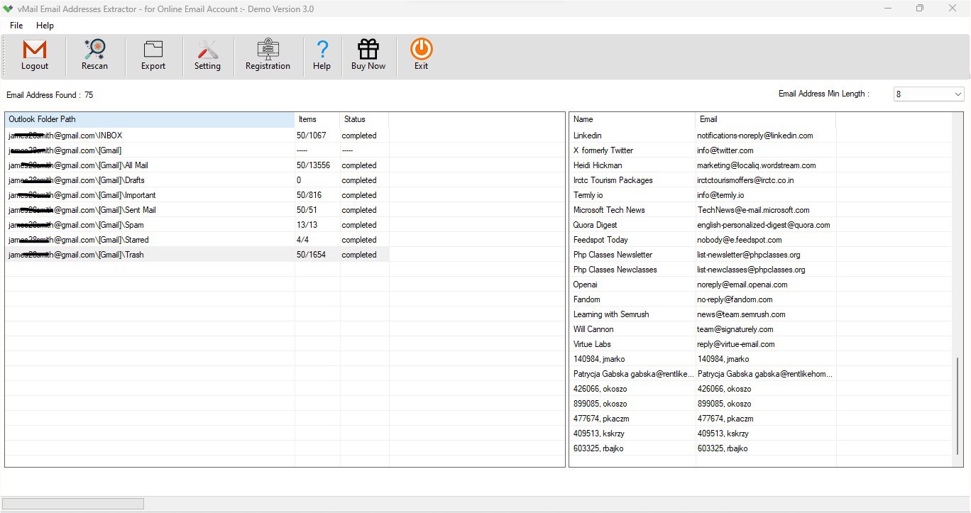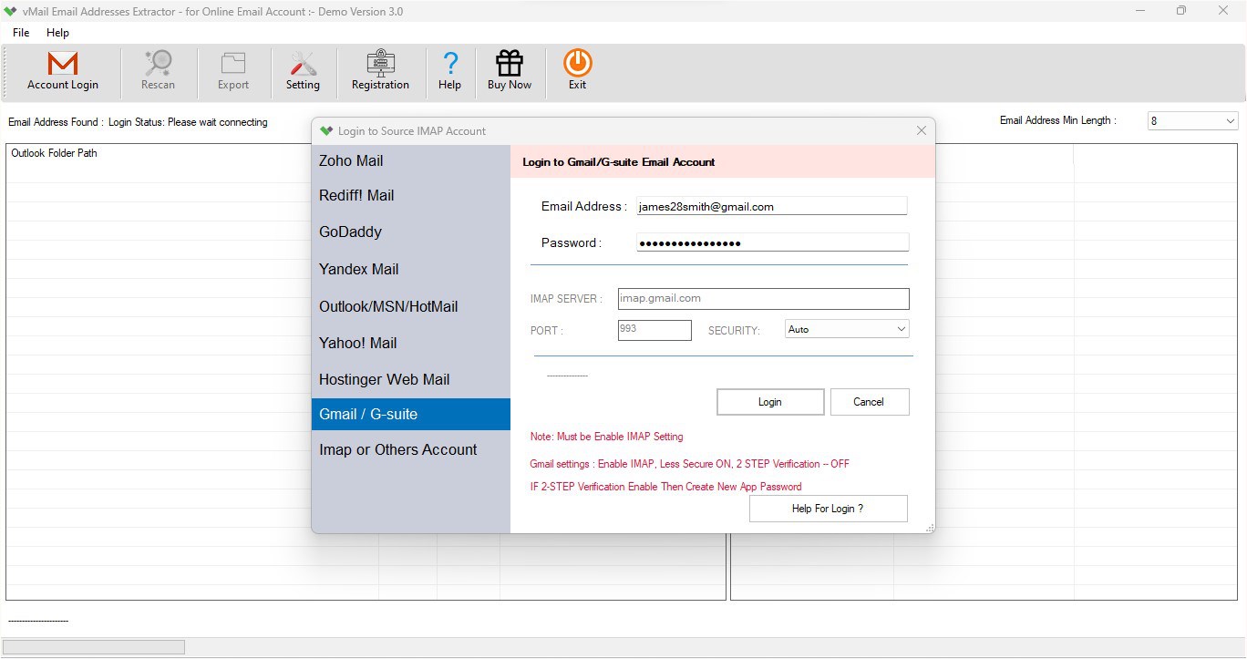 vMail Email Addresses Extractor for Online Email Account which is extracting email addresses from Gmail, Yahoo! Mail, Zoho Mail or Any IMAP Email Mailboxes Account. This Application fetch email ids from fields such as To, From, CC, BCC, Message Body Content. This software user-friendly, safe & secure, making it suitable even for technical & non-technical users.