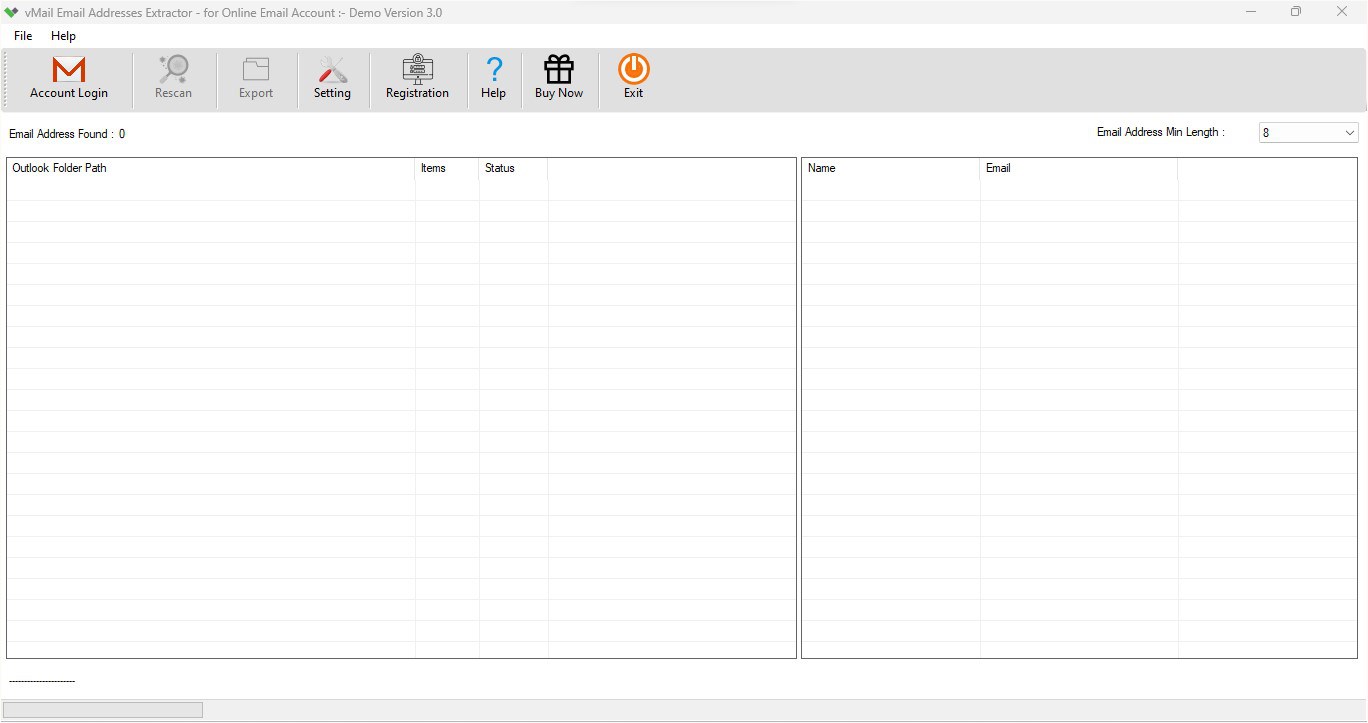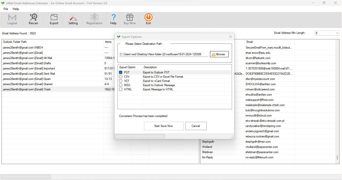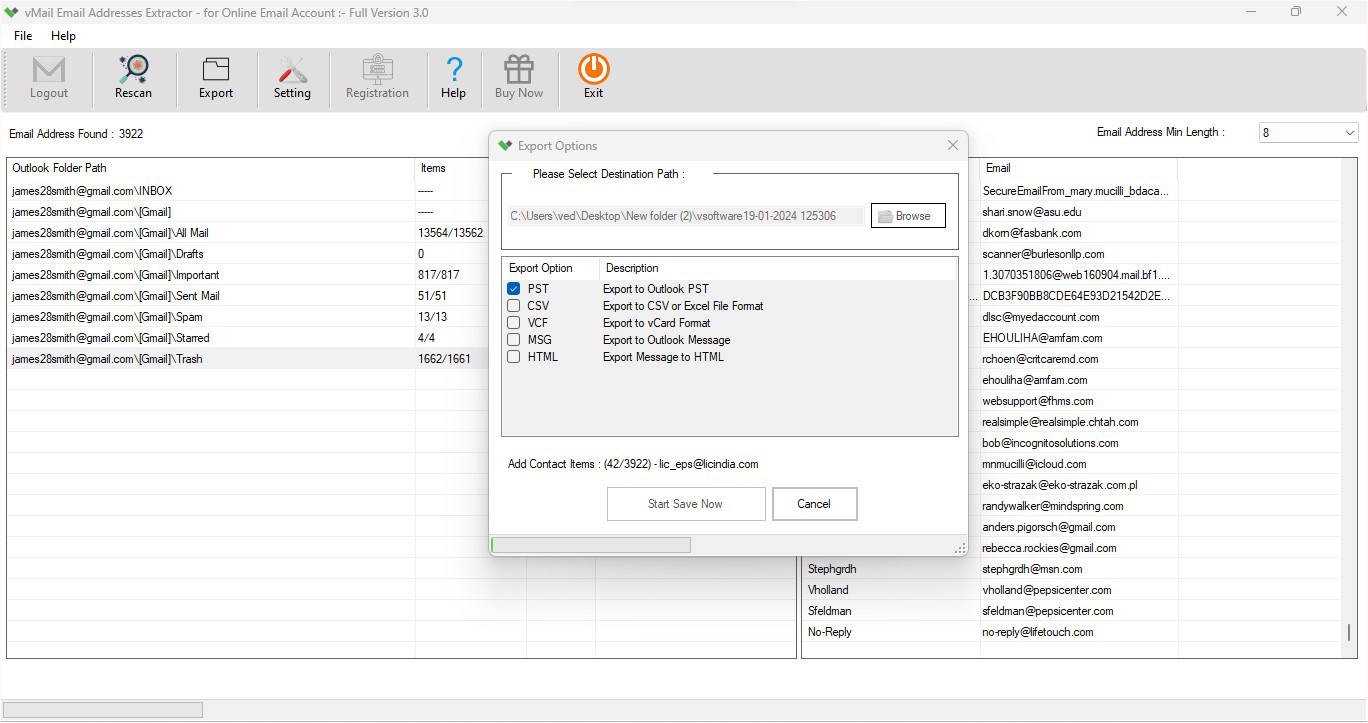 Limitation: Demo version enables you to preview of extracted email contact address – demo version top 50 message scanning each folders & Saved 30 email contact to Selected file format