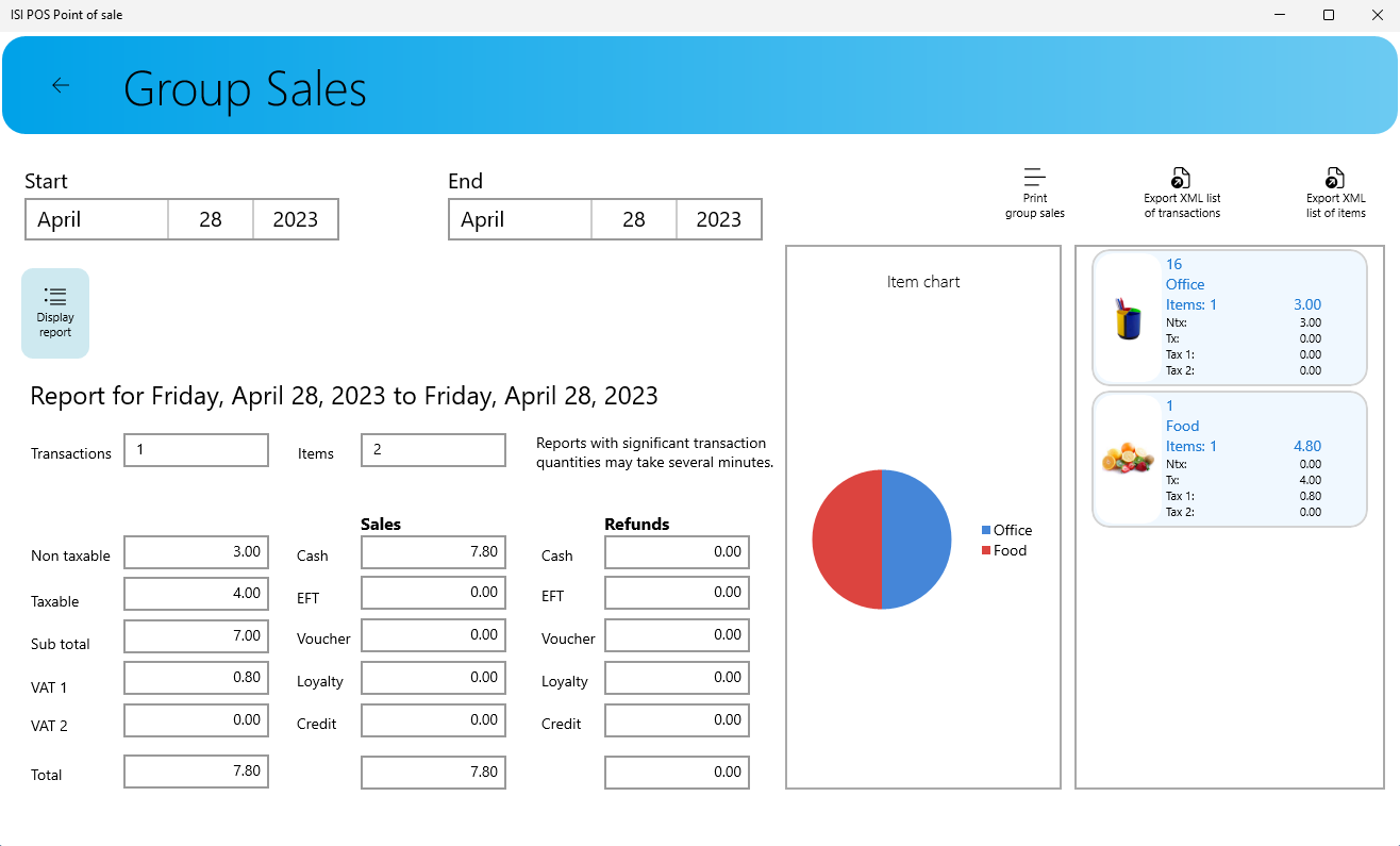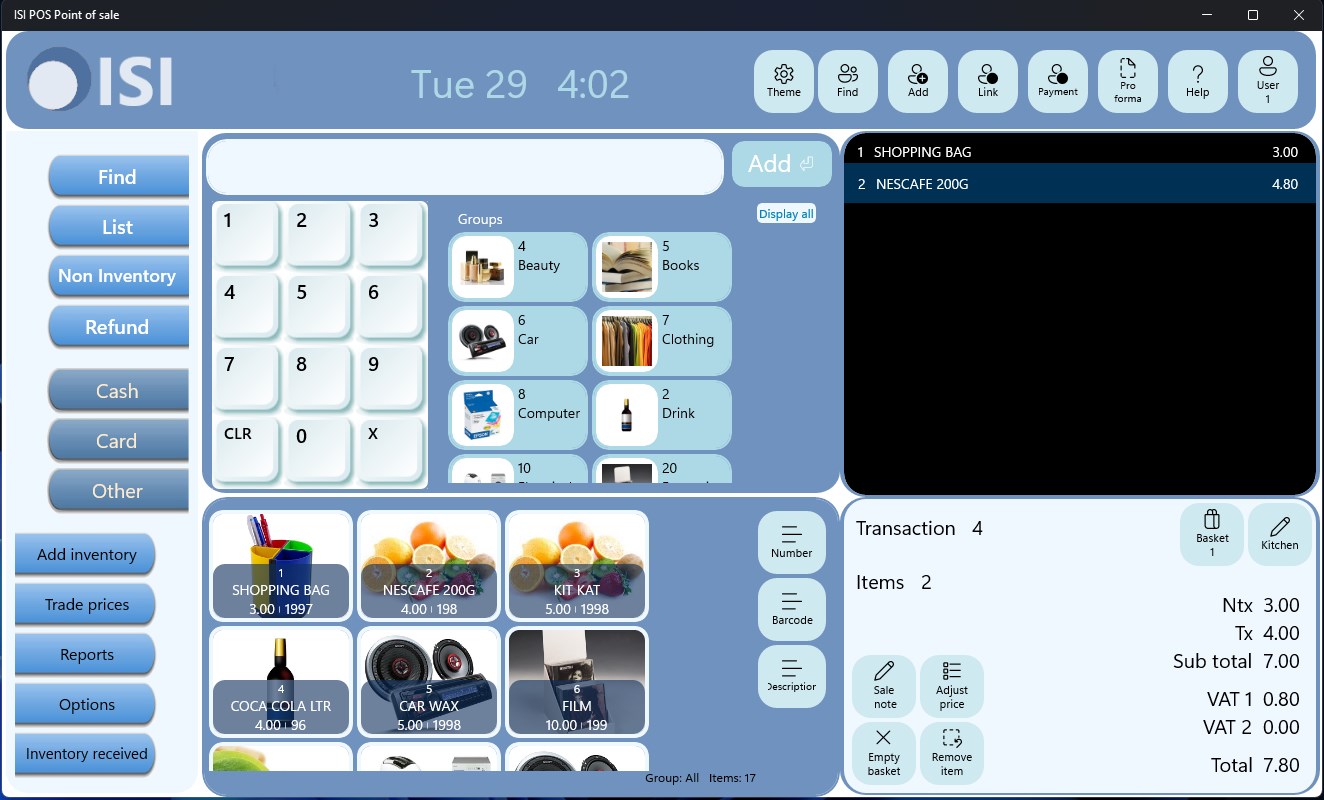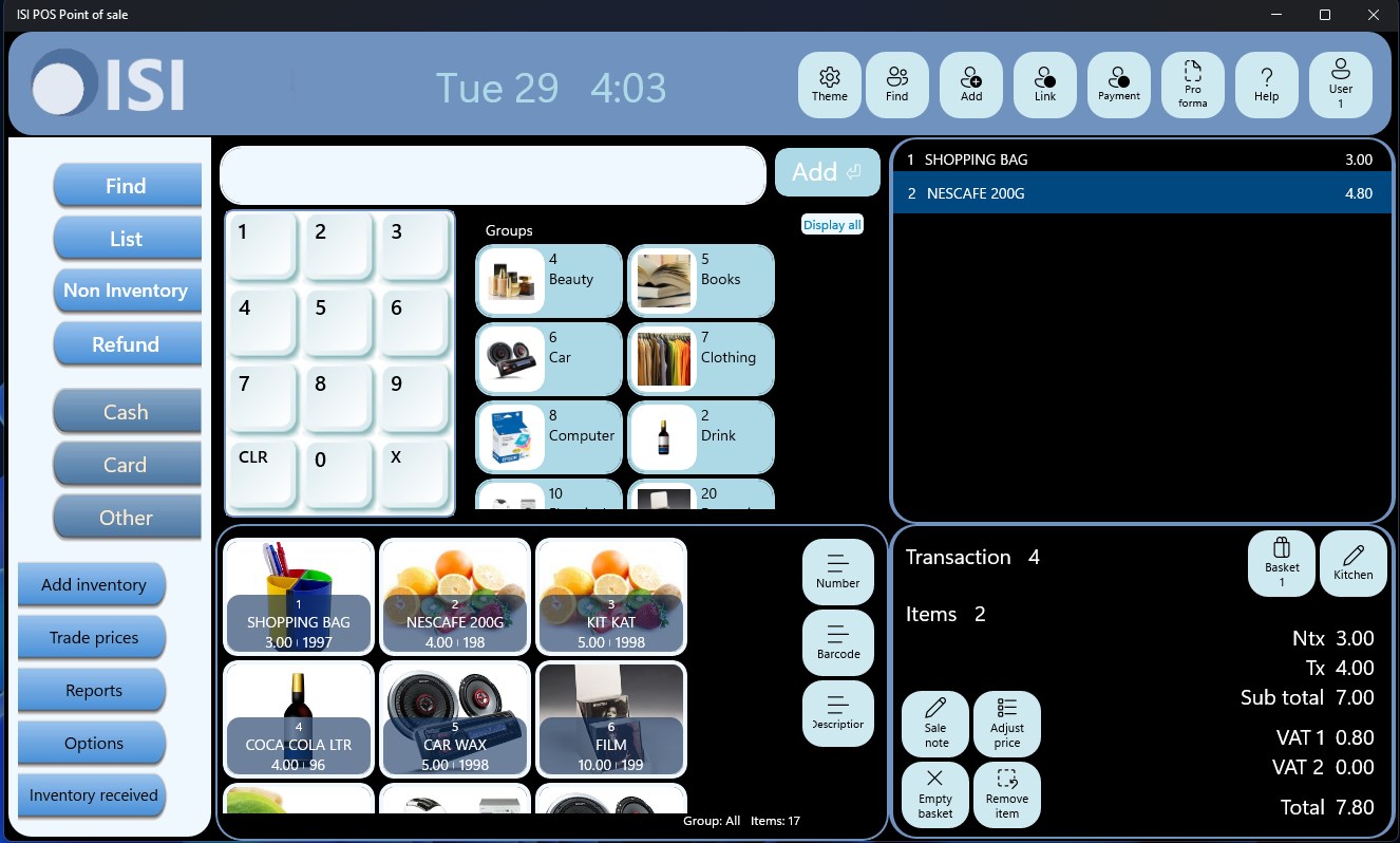 Sales summaries and comprehensive logs of all transactions and tax details can be viewed and exported to file (XML).Incorporates Buy one get one free and Buy two get one free facilitiesBarcode scanner and pole display supportRestaurant table and kitchen print optionTailored printouts for both inventory and customers via easy to follow check boxesNon inventory sale facility for items not in the databaseTrade price toggle optionImport information quickly and easily from an existing database (XML file).Built in customer database with access to current balancesPro forma invoicesReorder and out of stock reportsSeveral color themes available
