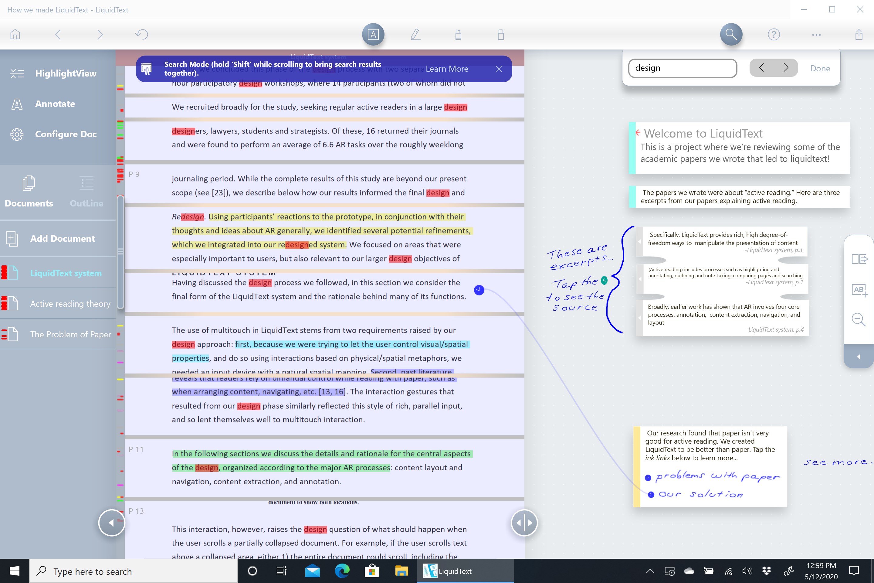 • Search for keywords across all your LiquidText documents