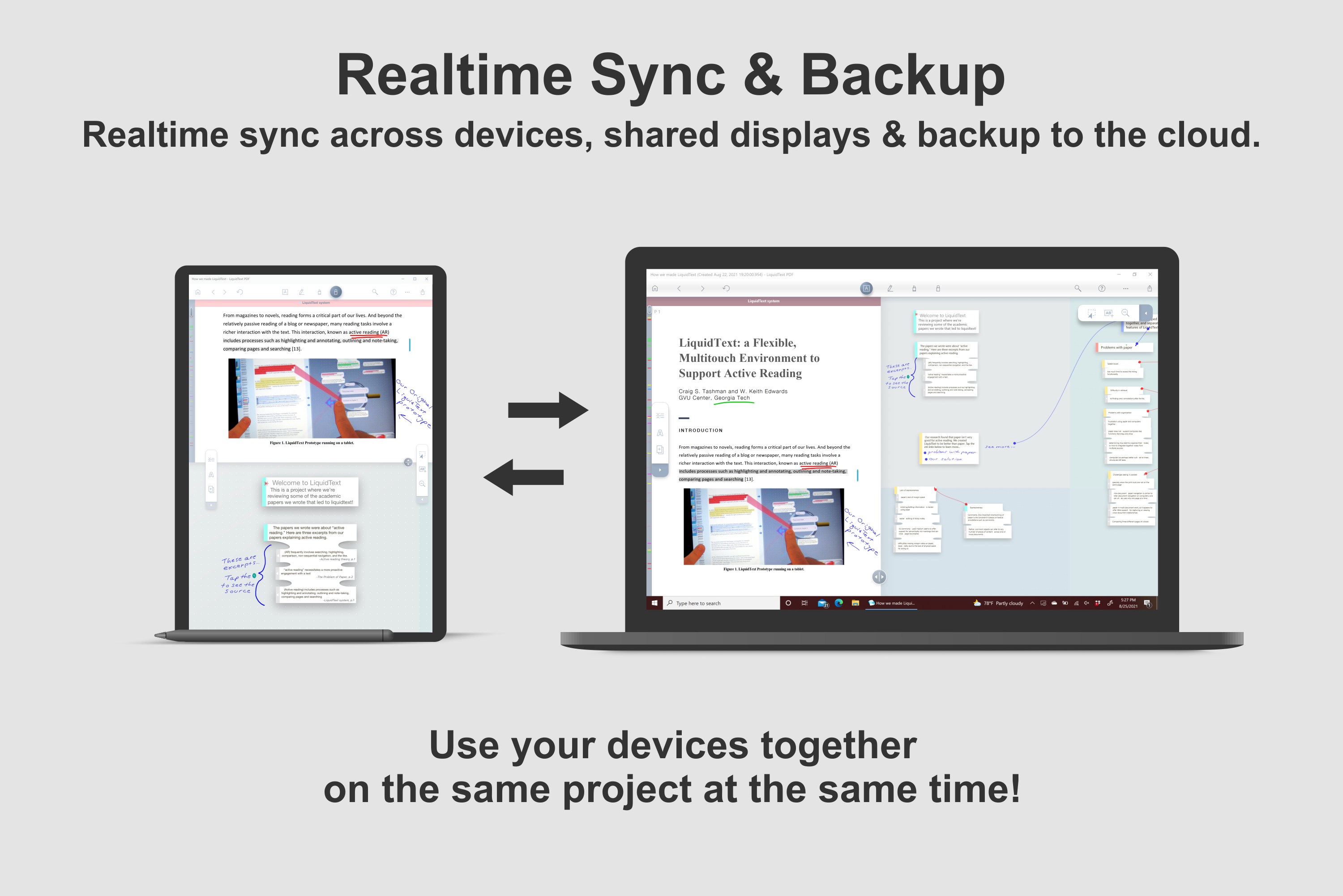 We have introduced LiquidText LIVE, a subscription version of LiquidText which supports: Real time synchronization between all your different LiquidText devices. Continuous cloud backup while you work. Multi device display, where all your devices can be used at the same time sharing monitors and input. Real time group collaboration is coming soon. An individual LIVE license allows you to run LiquidText on up to 10 personal devices on any supported platform for a single price. LiquidText LIVE Unlimited subscribers receive Priority Support, unlimited storage for LiquidText projects and select additional features. The original LiquidText purchase versions remain available.