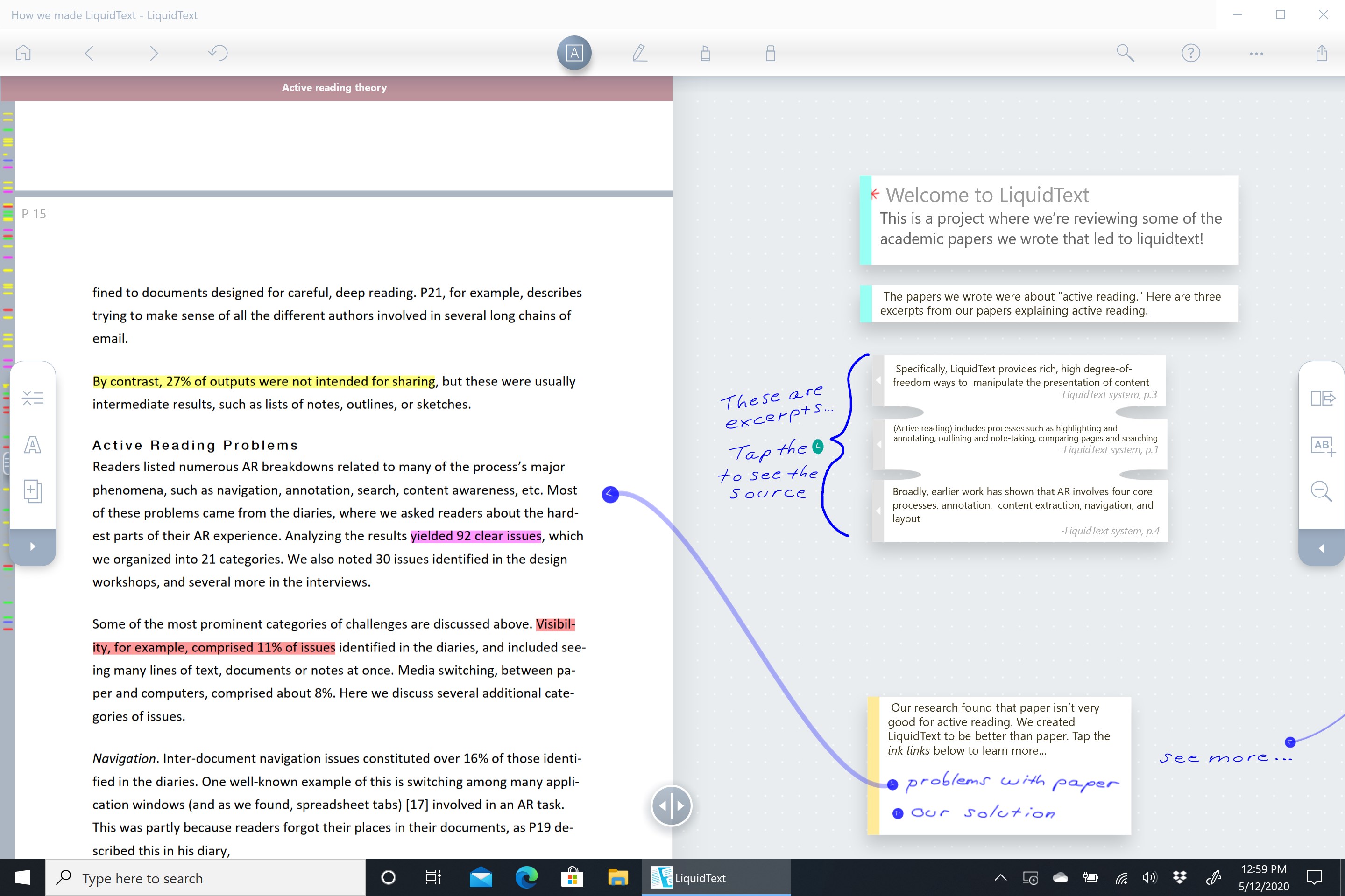 LiquidText offers a fast, natural way to review, gather, and organize information across all your documents: then apply the results to writing reports, meeting prep, or simply studying. Pull out key facts and connect them together, squeeze a document to compare sections, draw a line to connect ideas in different documents, comment on multiple pages at once, build upon your thoughts, and much more.