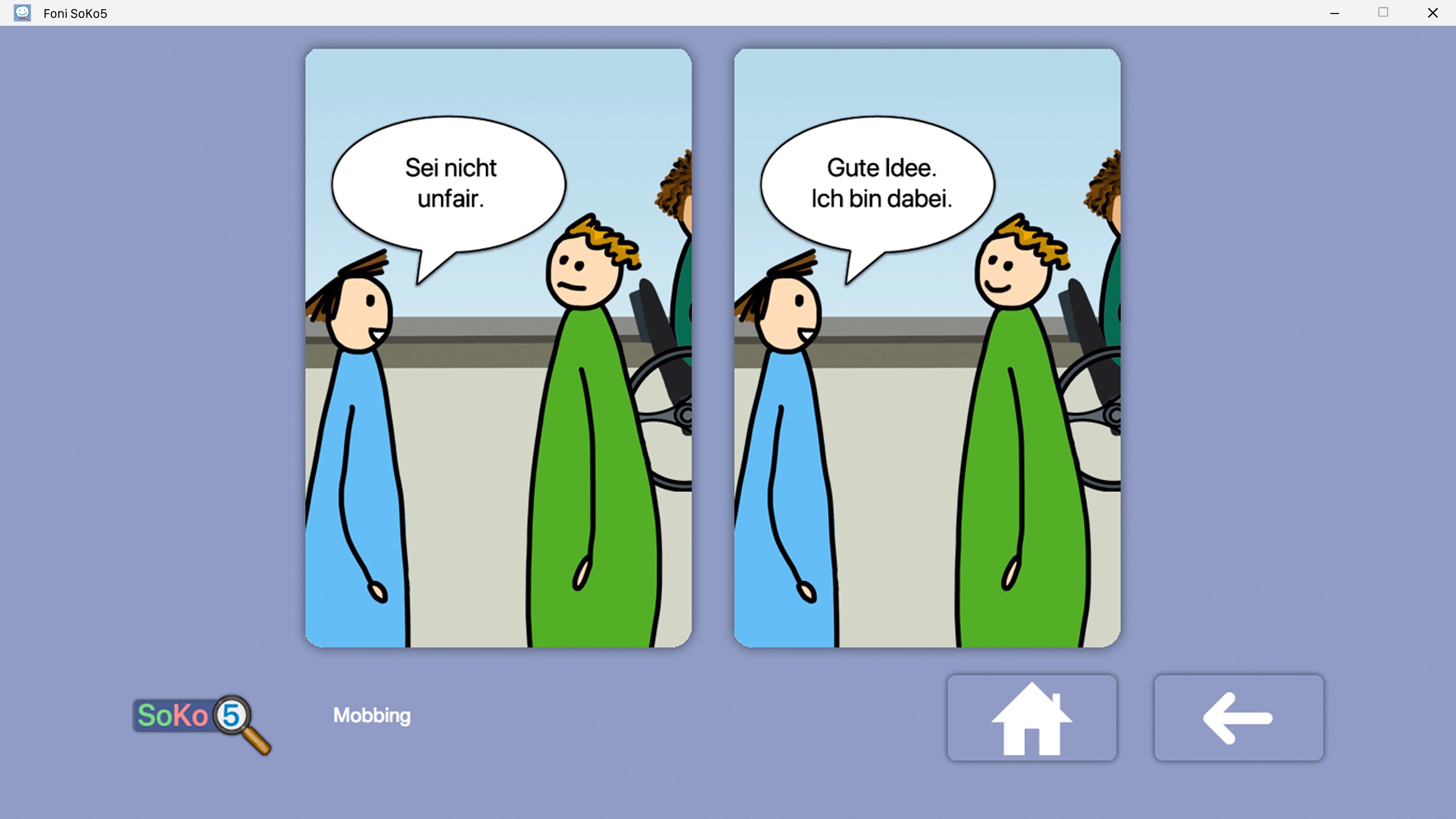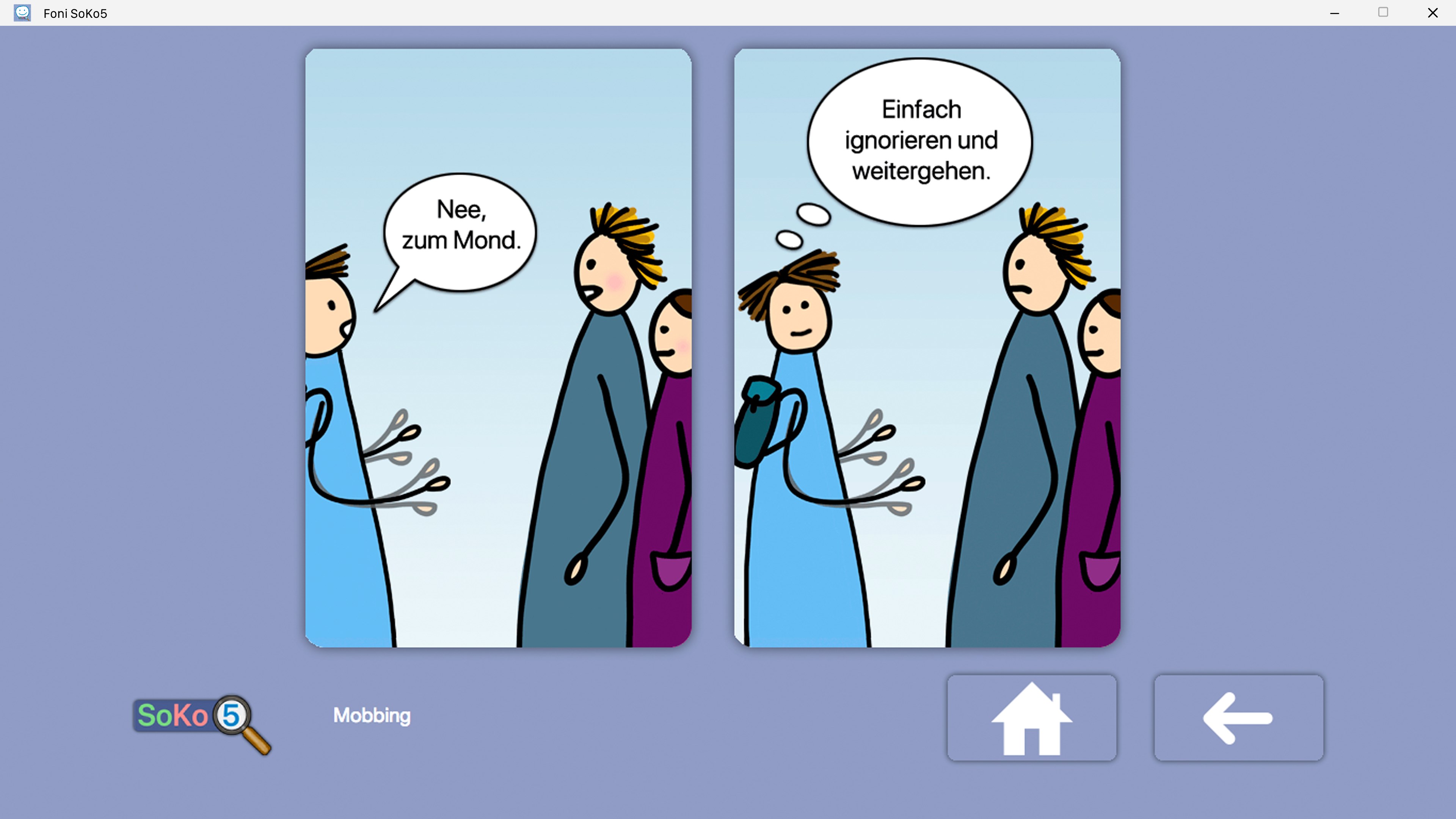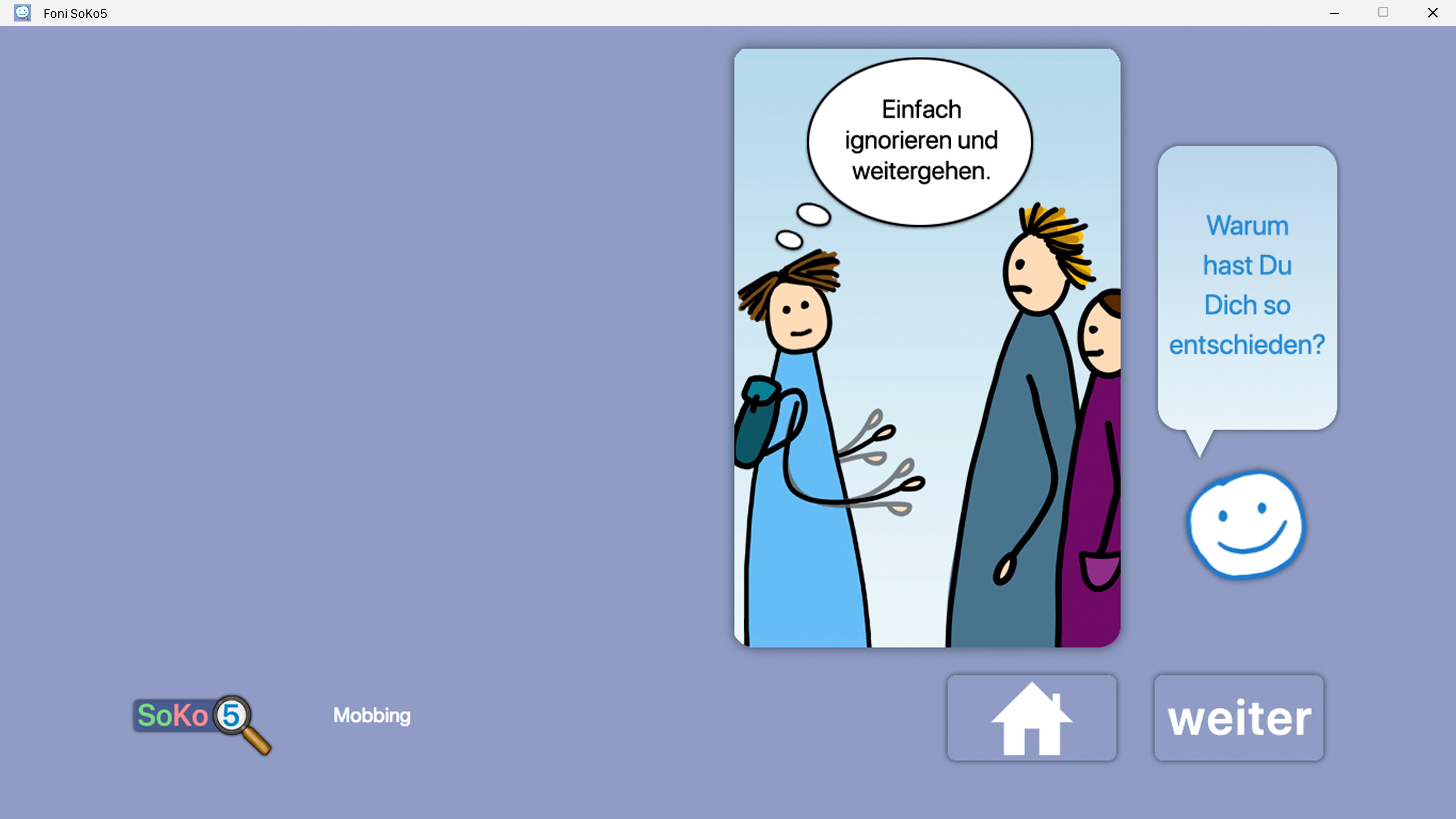 Das Training mit der Foni SoKo5 App sollte mit einer Fachkraft, einem Elternteil oder einem Coach erfolgen. Es werden zu einer Situation zwei Antwortmöglichkeiten aufgezeigt. Sobald eine Wahl getroffen wurde, erscheint die Frage „Warum hast Du Dich so entschieden?“. Dieses Hinterfragen soll zum Dialog anregen. Auch mögliche Missverständnisse können gleich geklärt werden, wenn zum Beispiel die Cartoon-Situation unterschiedlich gedeutet wird.