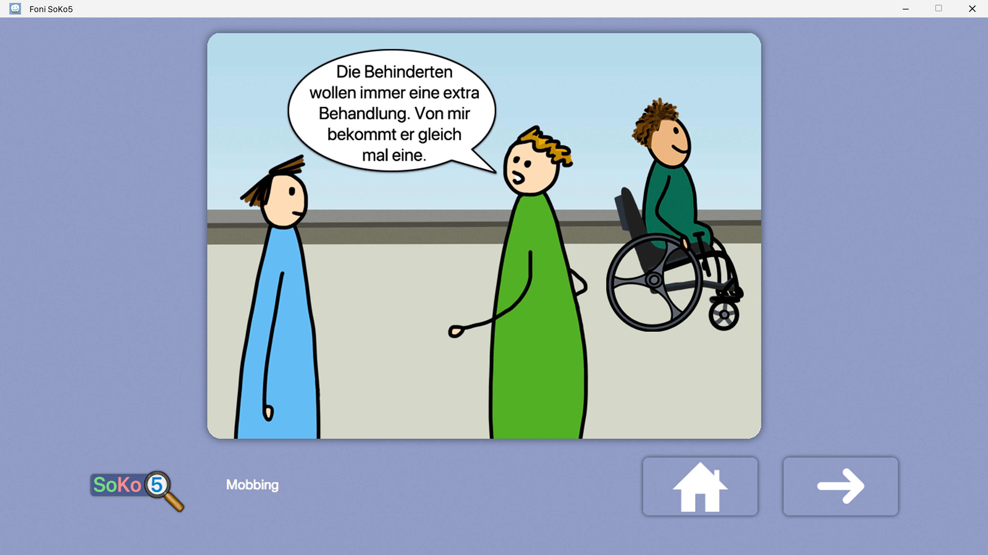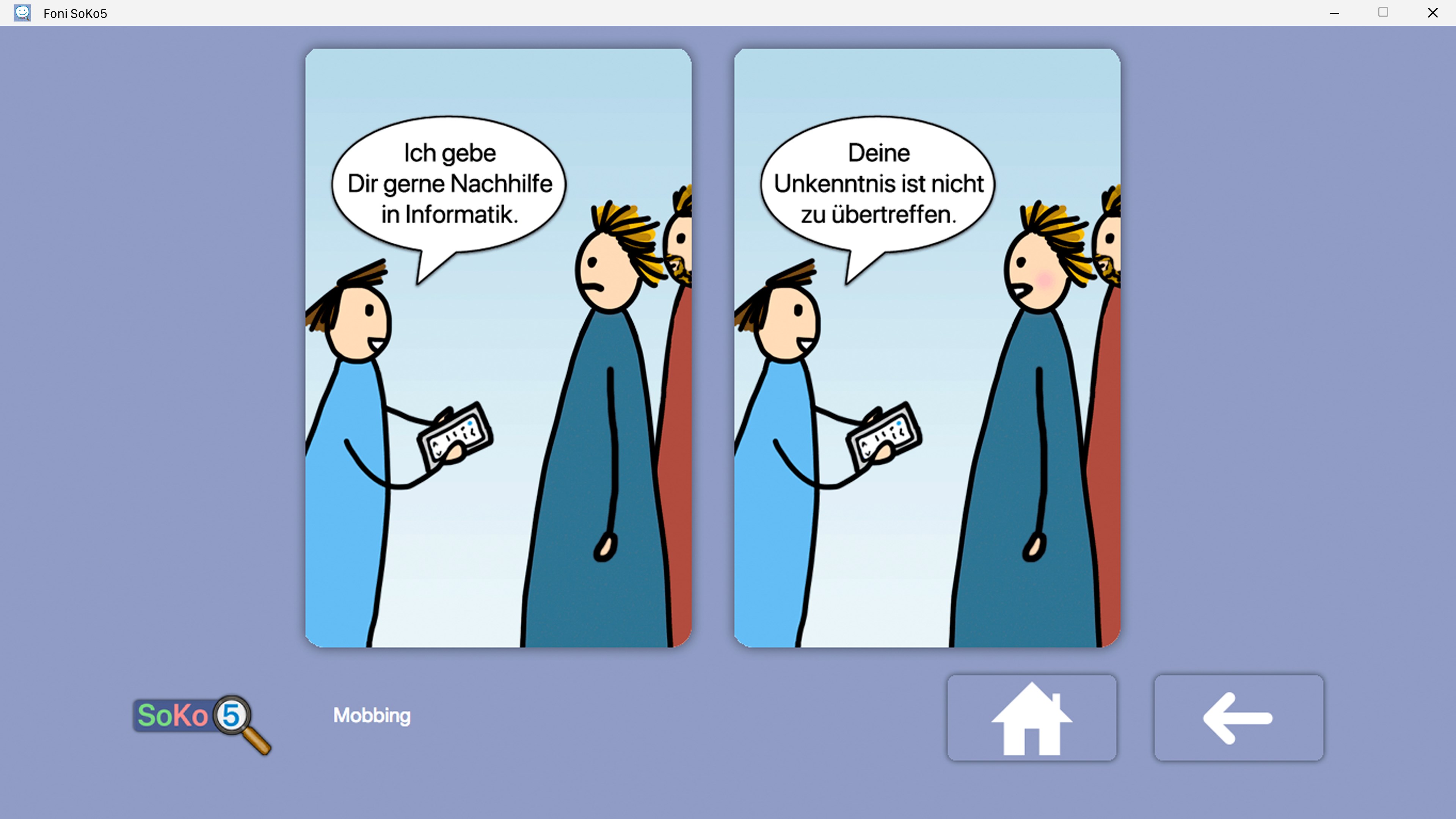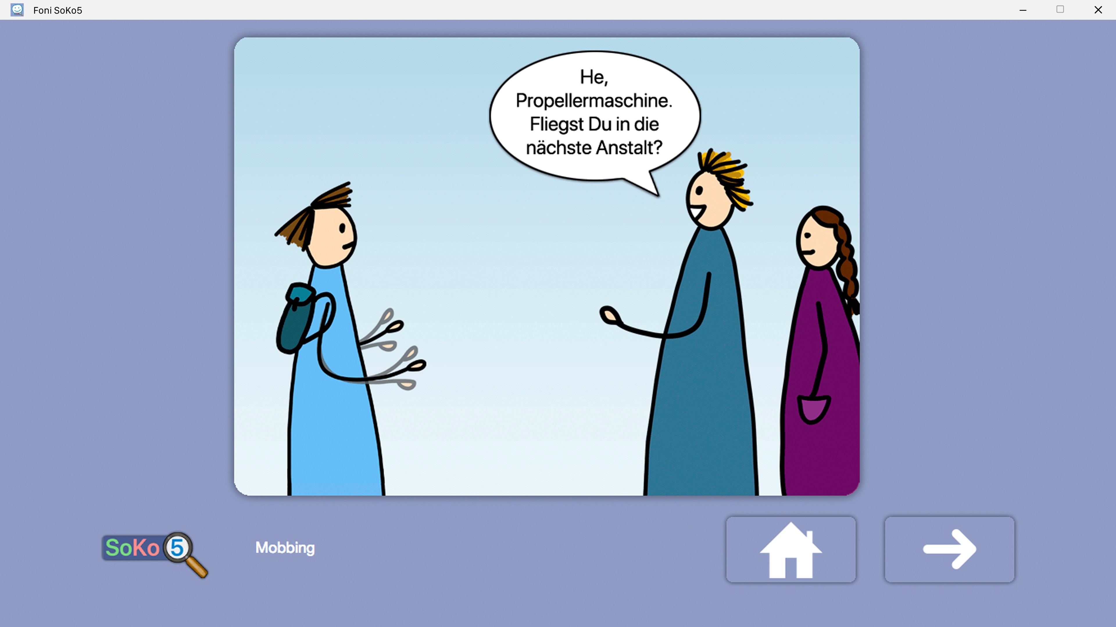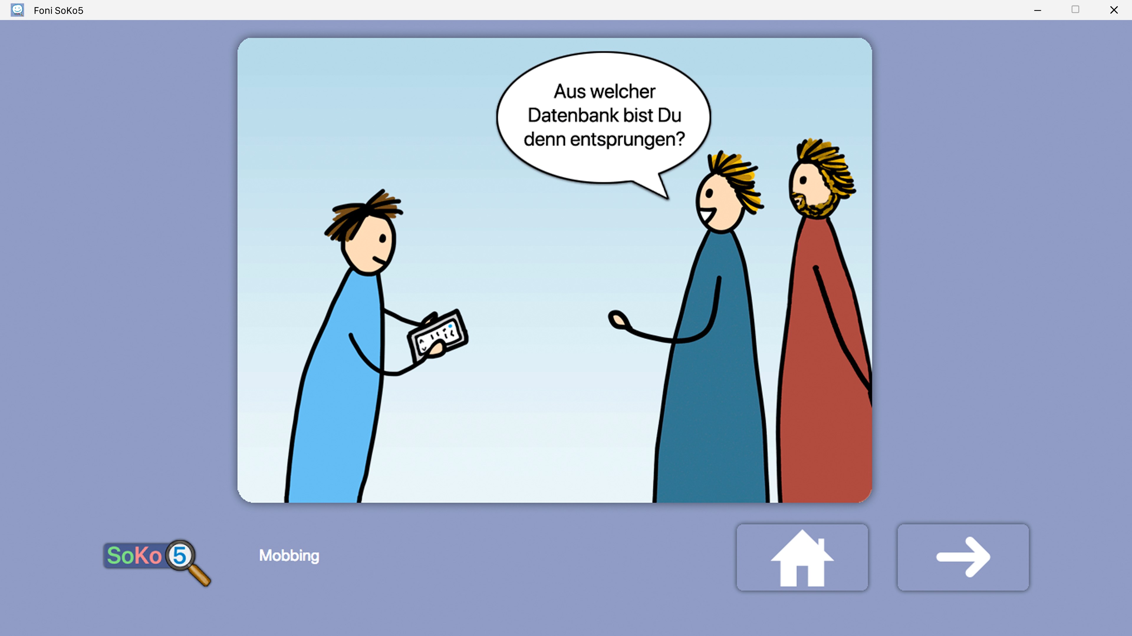 Das Training mit der Foni SoKo5 App sollte mit einer Fachkraft, einem Elternteil oder einem Coach erfolgen. Es werden zu einer Situation zwei Antwortmöglichkeiten aufgezeigt. Sobald eine Wahl getroffen wurde, erscheint die Frage „Warum hast Du Dich so entschieden?“. Dieses Hinterfragen soll zum Dialog anregen. Auch mögliche Missverständnisse können gleich geklärt werden, wenn zum Beispiel die Cartoon-Situation unterschiedlich gedeutet wird.