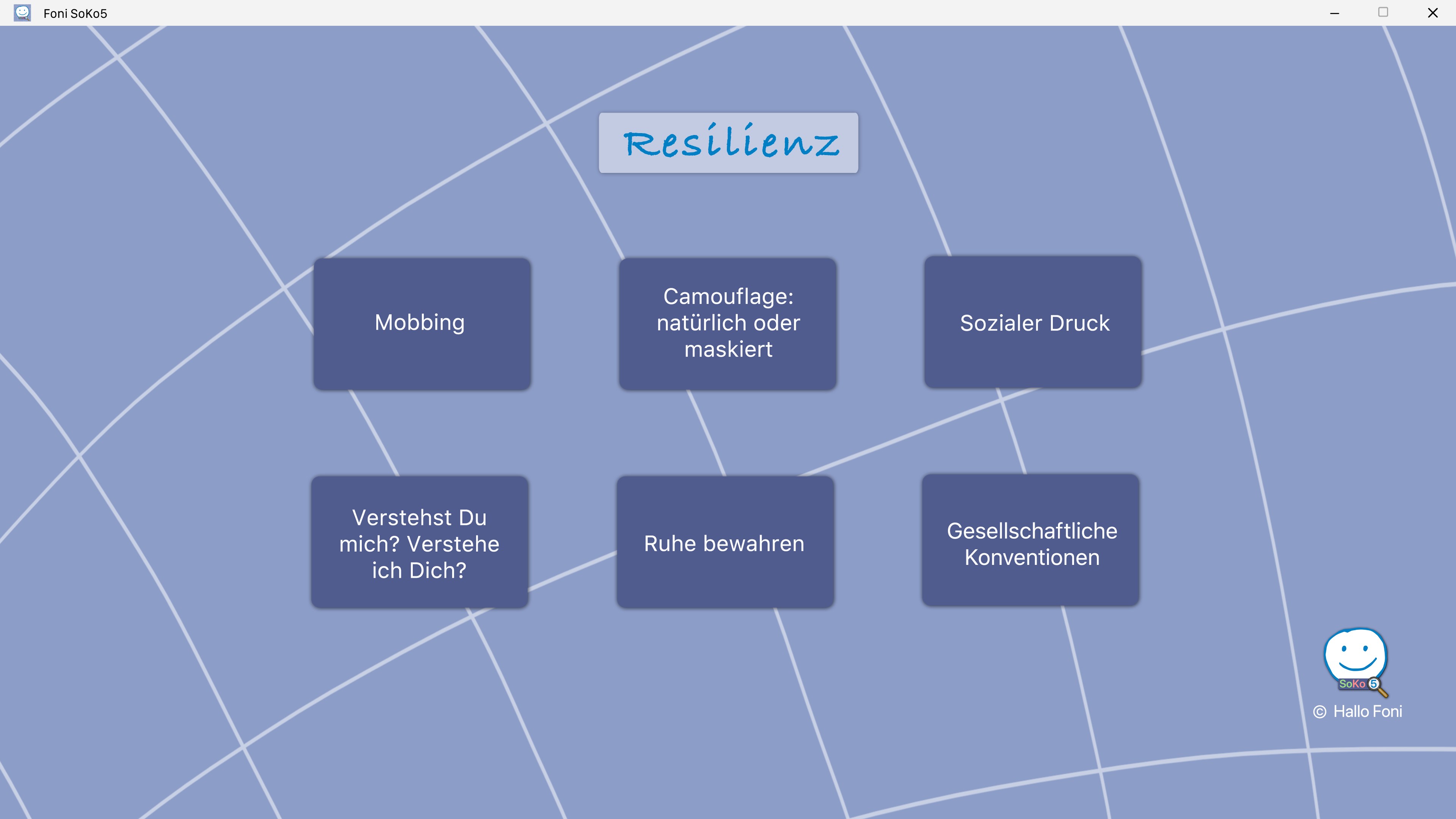 Mit der Foni Soko5 App wird anhand von Cartoons das eigene Stressmanagement trainiert. Die App umfasst dieses Langzeitziel, das in sechs Bereiche eingeteilt ist. Die sechs Bereiche beinhalten jeweils separate Kurzlernziele.