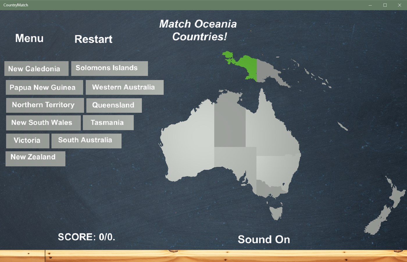 CountryMatchOceania is an educational game that will test your geography skills. You will have to associate each country of Oceania with its position in the map. First you have to click on the name of the country and then on the position on the map. If the match is right you gain a point. If it is wrong you gain an error. When you have clear the stage, you can see your score and the teacher comment.