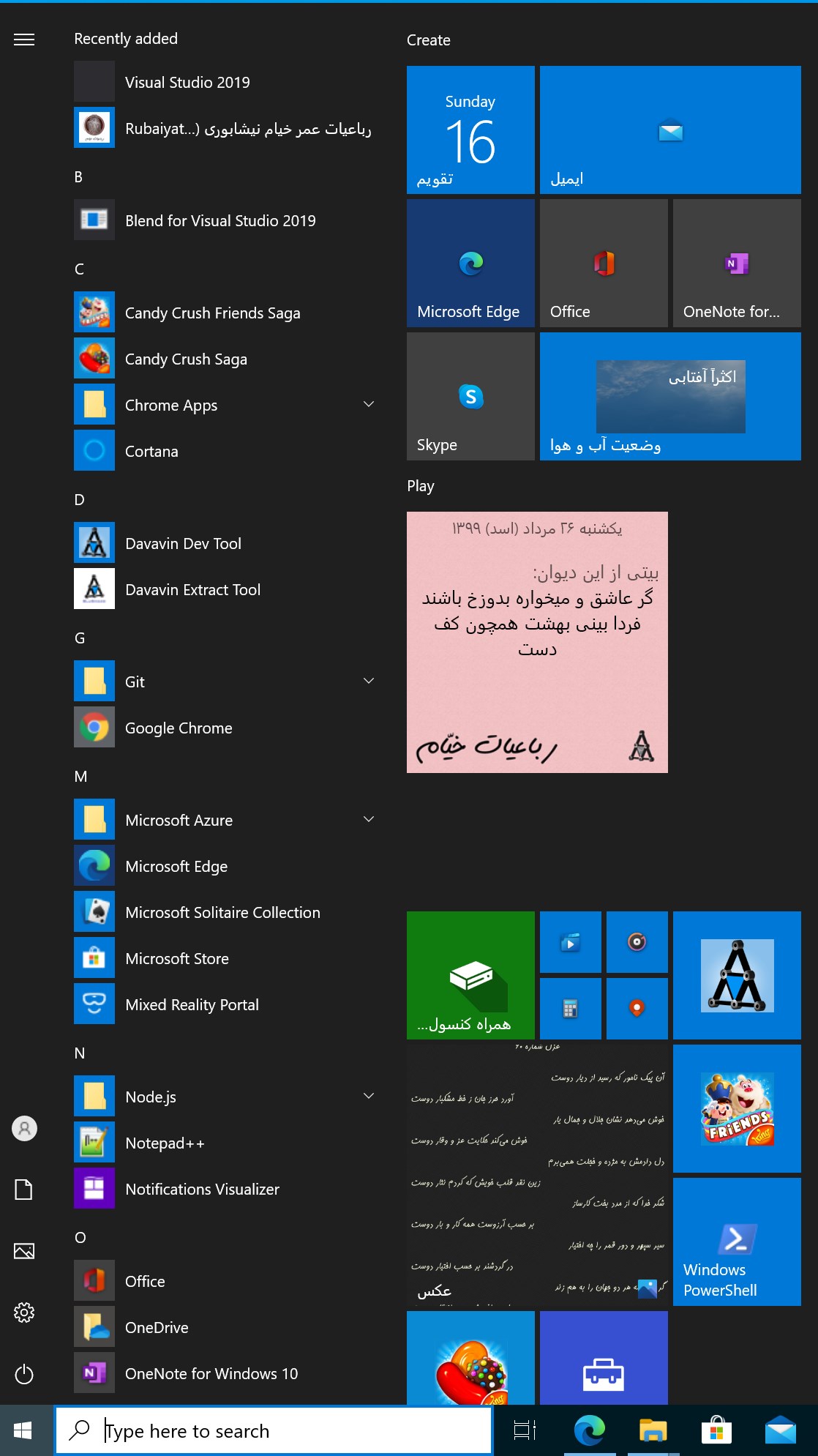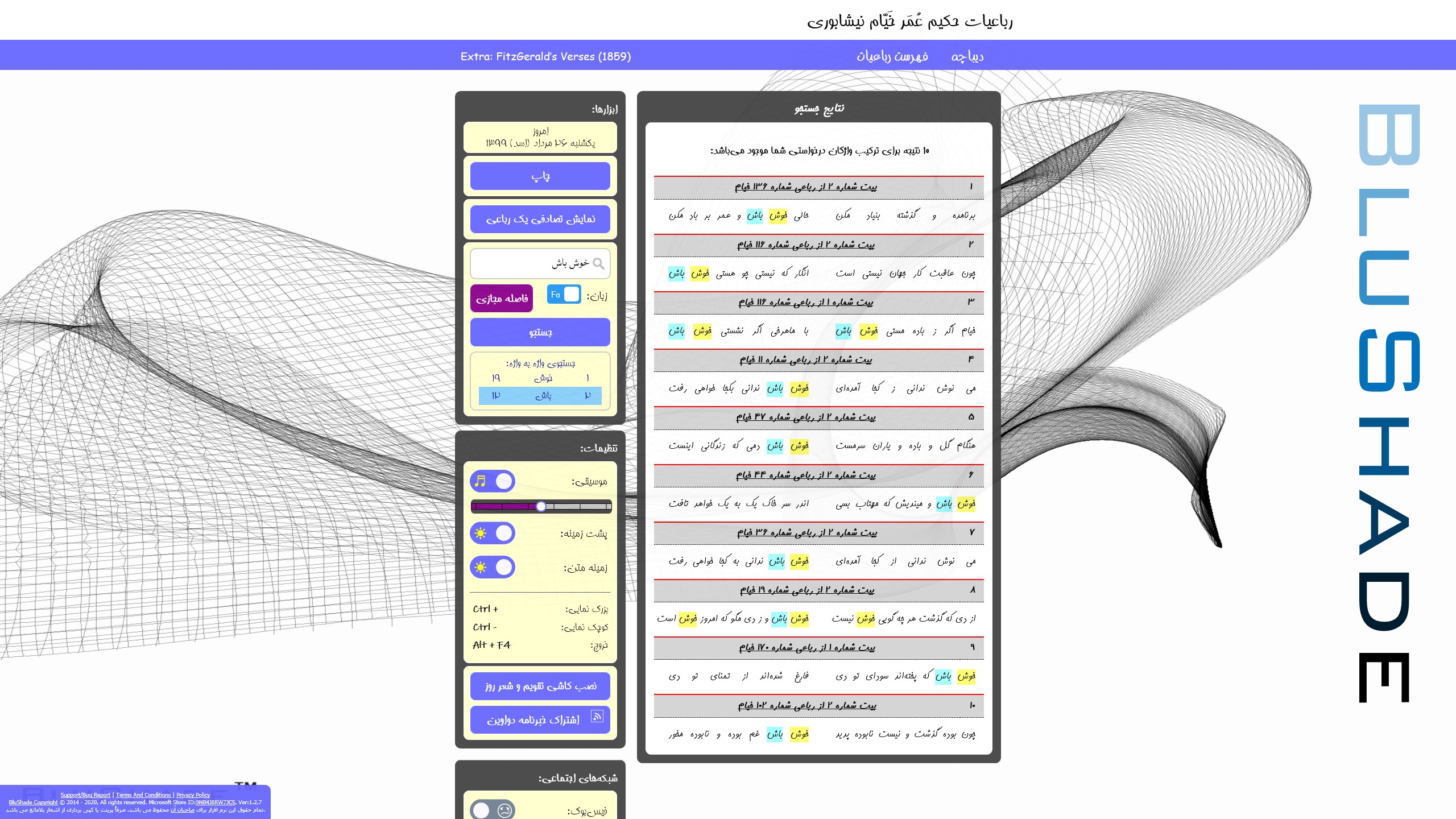 Ability to search single words as well as any combination of words in Farsi (Persian) & English.Incremental search (Real-time Suggestions) for words you want to search within the Rubaiyat or in FitzGerald\'s English Verses .Rendering poems into images with 3 different backgrounds.Capturing and saving the rendered poems as image files (.png).Sharing the poems as rendered images on social networks such as Twitter or Emailing them.Displaying Persian Calendar (Jalali Calendar) - Hijri ShamsiHaving an option for setting up a Windows Live Tile on Start Menu in which the app could display both Persian Calendar and a daily Bait of Rubaiee.Playing Persian music. (Persian Santoor)Ability to automatically or manually adjusting background & text color between light and dark modes for ease of reading. Ability to automatically fit poems into print area (paging) based on user choice of paper size & displaying a preview before printing them.Ability to work offline.Typing in Persian (Farsi) with no need of changing keyboard from English to Persian, or adding Persian keyboard or Persian language to your Windows.Ability to randomly show you a Robaiee.Ability to magnify all contents (text and images).Built-in link to Davavin Newsletter signup page. (once you are registered, you can enjoy our discounts and free apps in the future.)