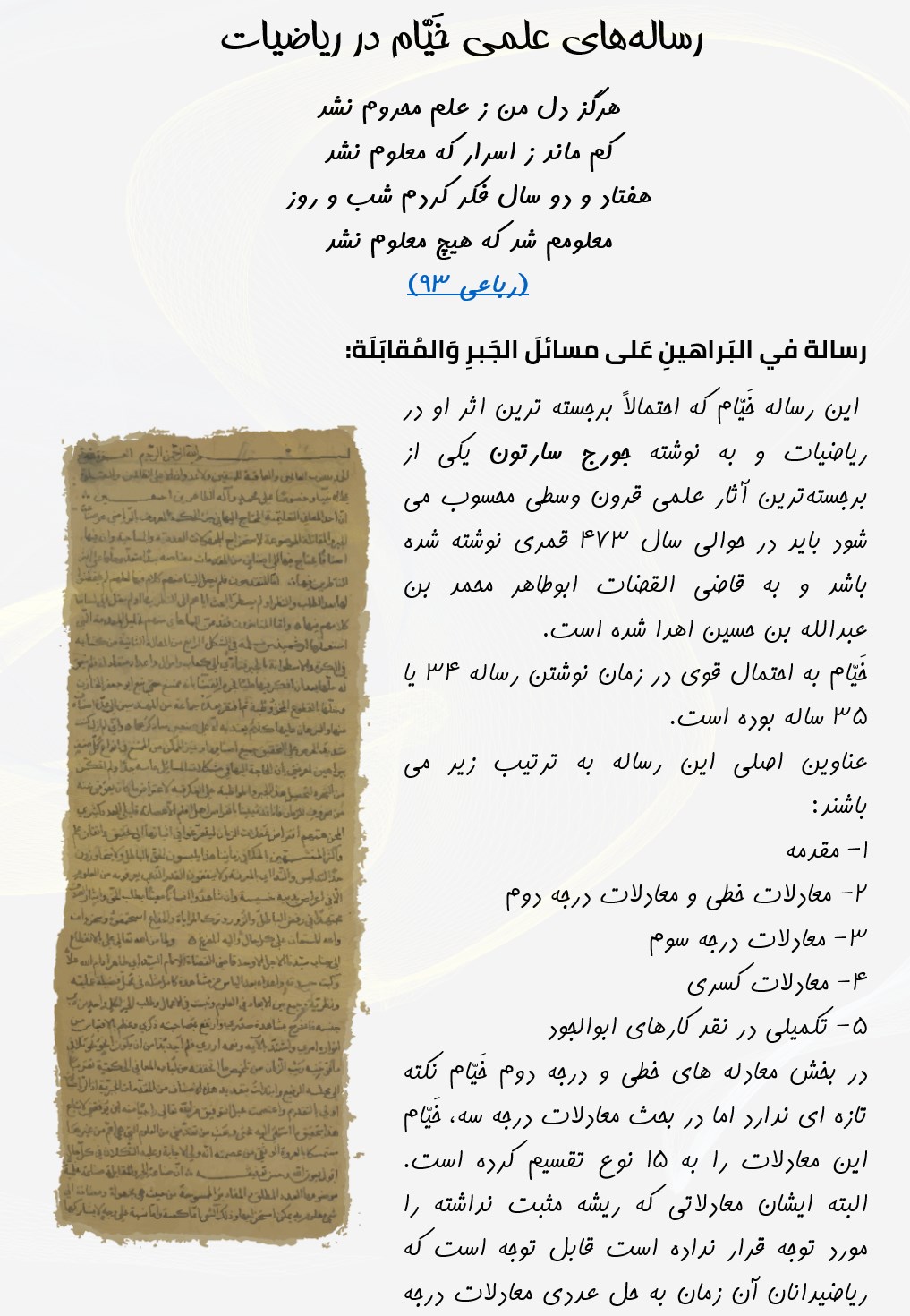 He was born in Nishapur, in northeastern Persia, and was contemporary with the rule of the Seljuks around the time of the First Crusade. He was part of the scientific team which was in charge of designing the Jalali calendar, a solar calendar with a very precise 33-year intercalation cycle that provided the basis for the Persian calendar that is still in use after nearly a millennium.