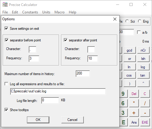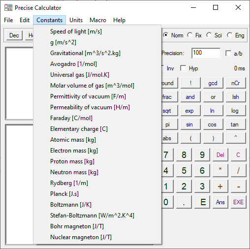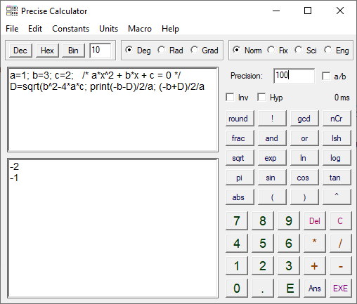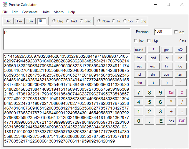 Scientific high precision calculator can perform complex calculations using all usual mathematical functions, statistical functions, prime numbers, PI, vectors, matrices, complex numbers, fractions, integral. You can set the precision to more than a million digits. It is also programmable by commands if, goto, print, return.