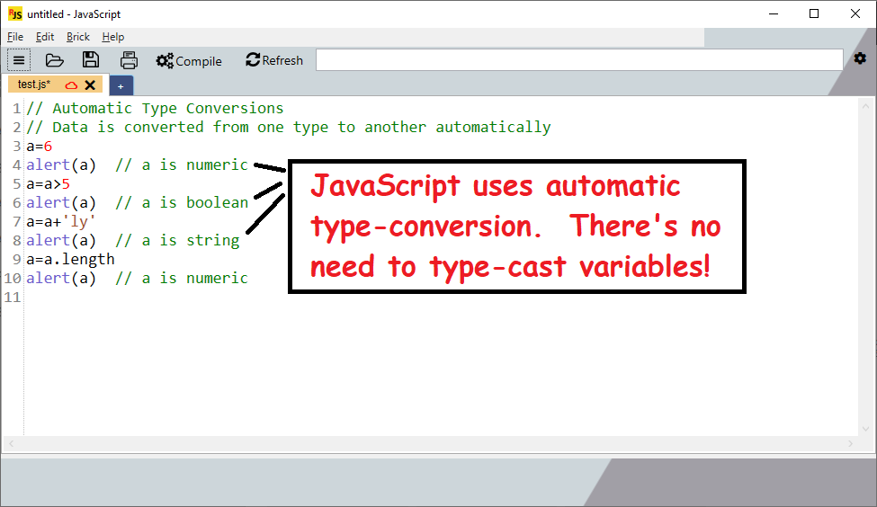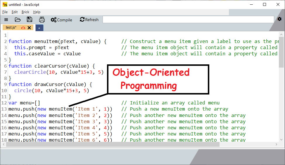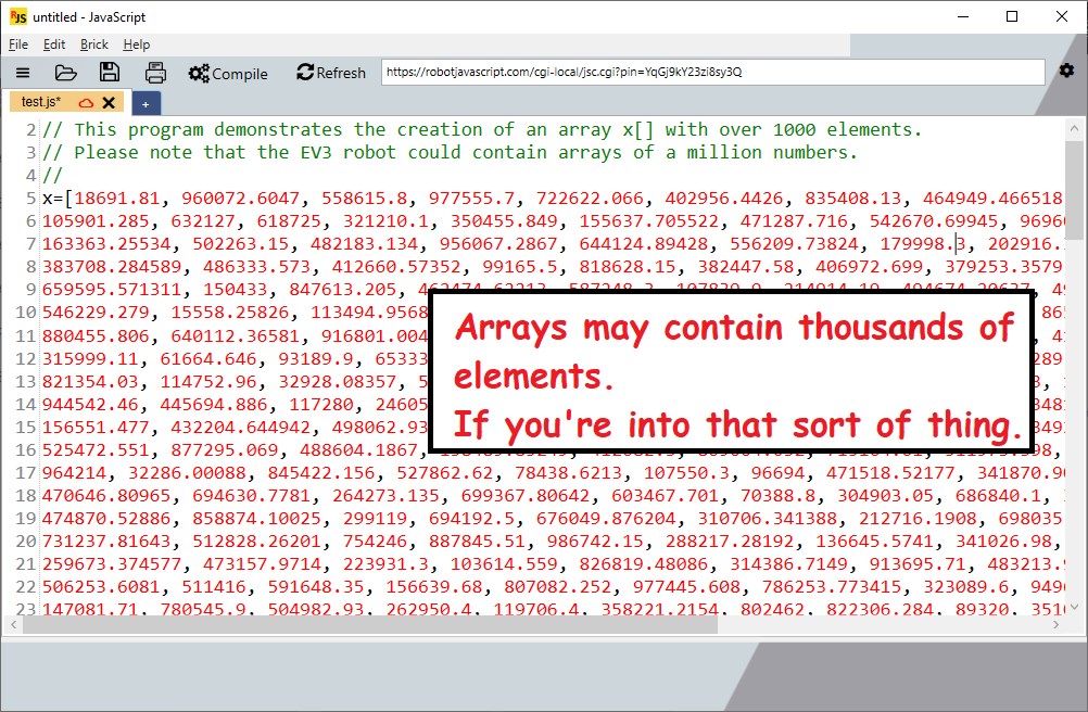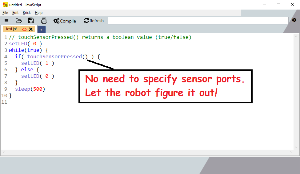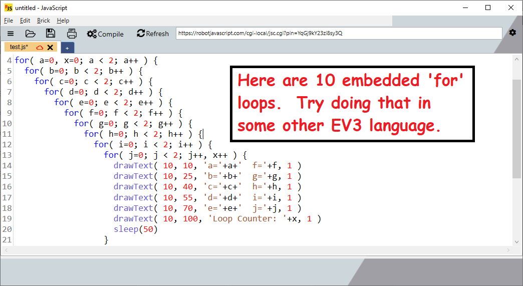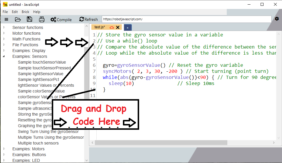 A JavaScript compiler for LEGO EV3 robots. This software only works with LEGO EV3 Robots. Please note: if you do not have a LEGO EV3 robot, then there is no need to download this software. Write code for your EV3 robot using a simple text based language: JavaScript. Dozens of example programs are provided to teach basic JavaScript programming techniques. Drag-and-drop code from the lists of examples into the editing window. Drag-and-drop code from websites, emails, text files, and shared files. If working as a team in First LEGO League, you can share code with other team members through the compiler using "code sharing". Or, view code sharing URLs in your favorite web browser. The compiler creates "descriptive" error messages (not cryptic error messages). The compiler offers suggestions on how to fix the errors.