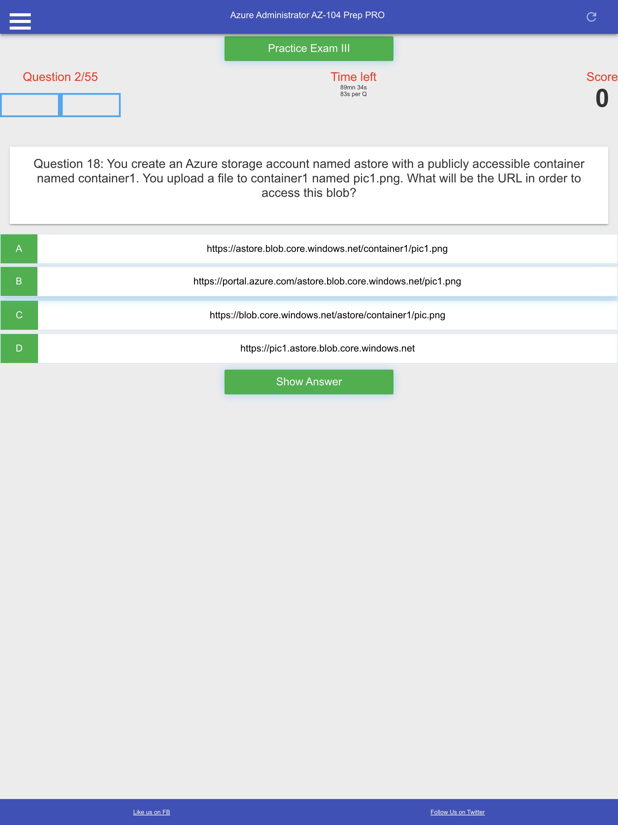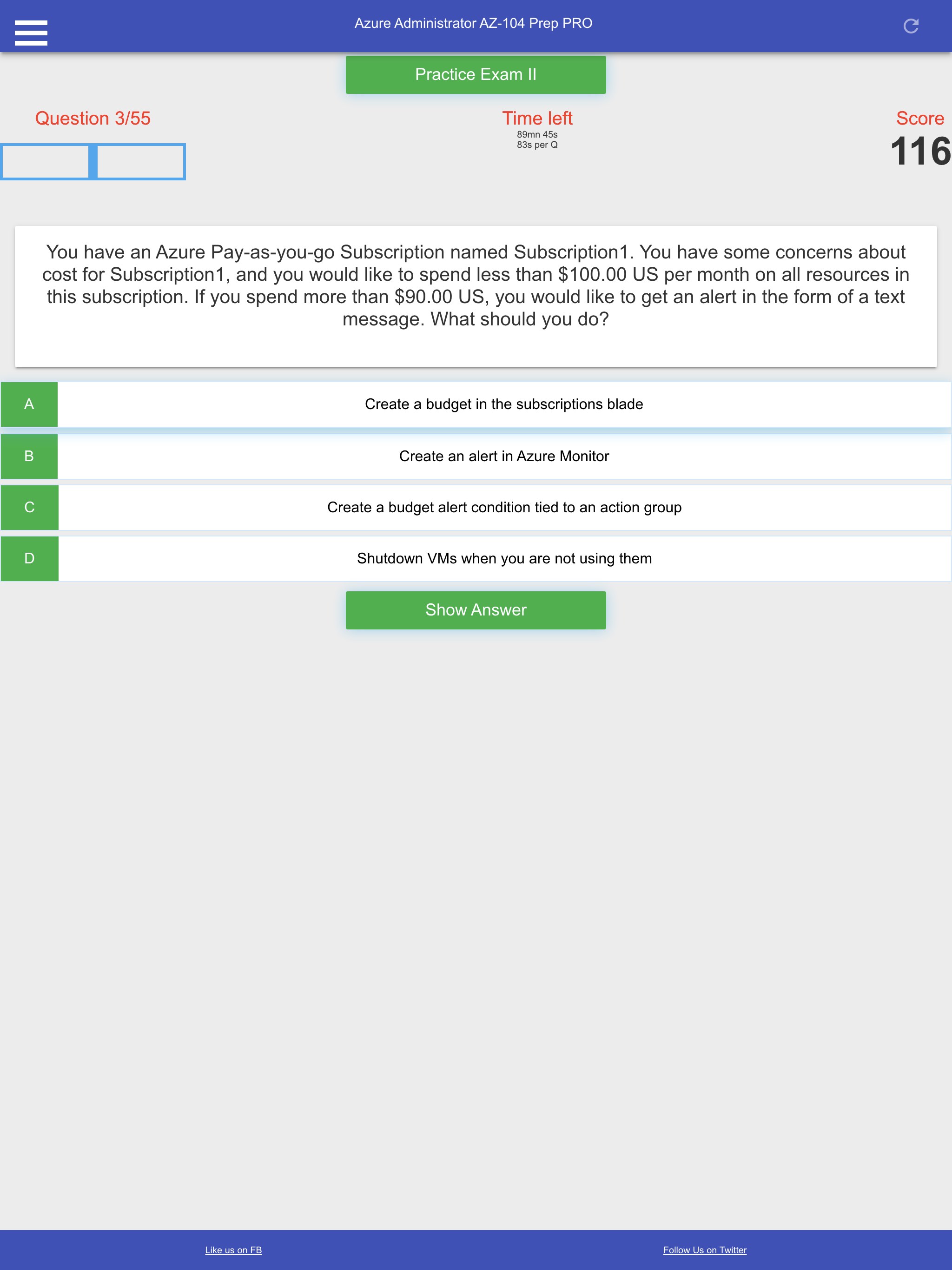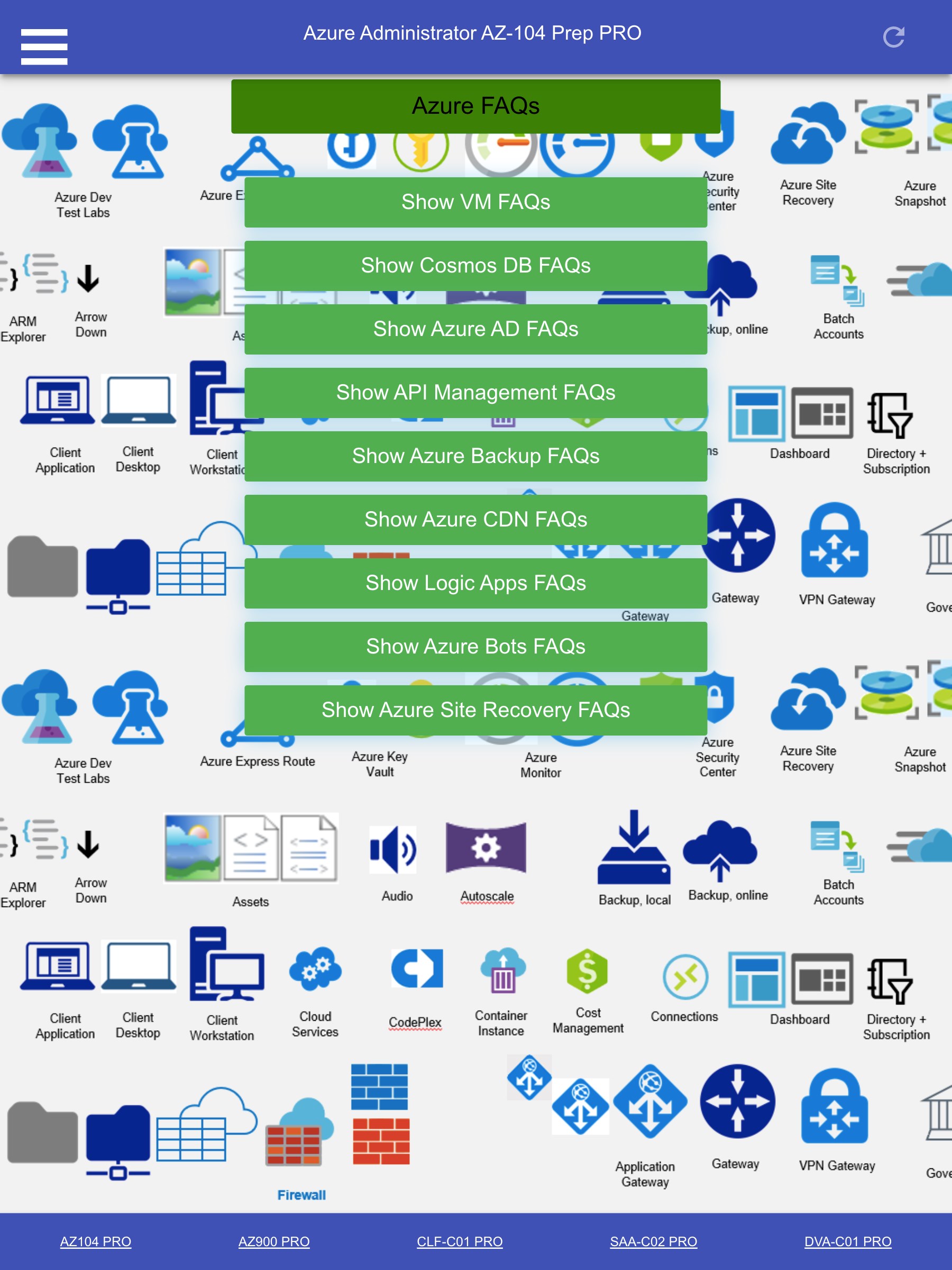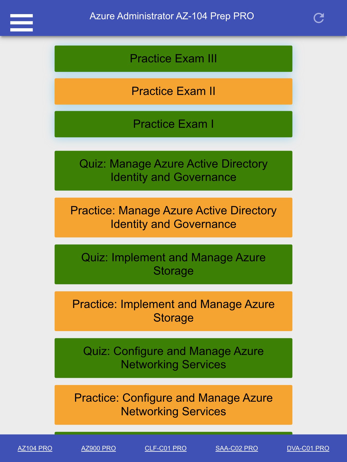 Do you want to become a certified Azure Administrator? This App helps you prepare for the Microsoft Azure Administrator AZ104 Certification with Quizzes and Practice exams. Quizzes are organized by up to date exam categories.