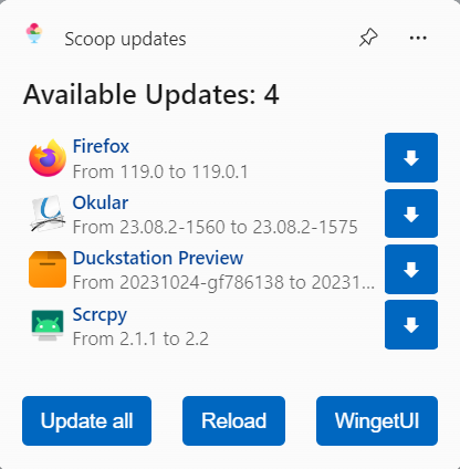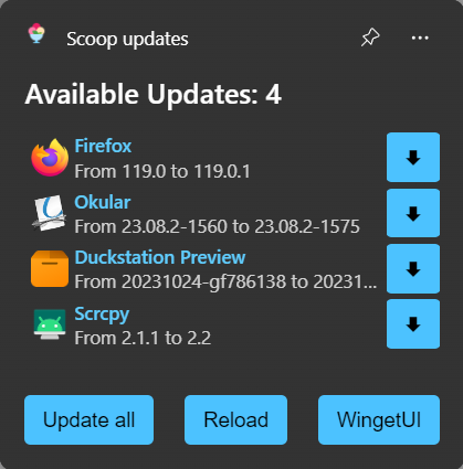 Easily see which packages can be updatedUpdate them all or update a selection of themFilter between all the packages or the packages from a specific Package ManagerUniGetUI is required as a backend for Widgets to work.