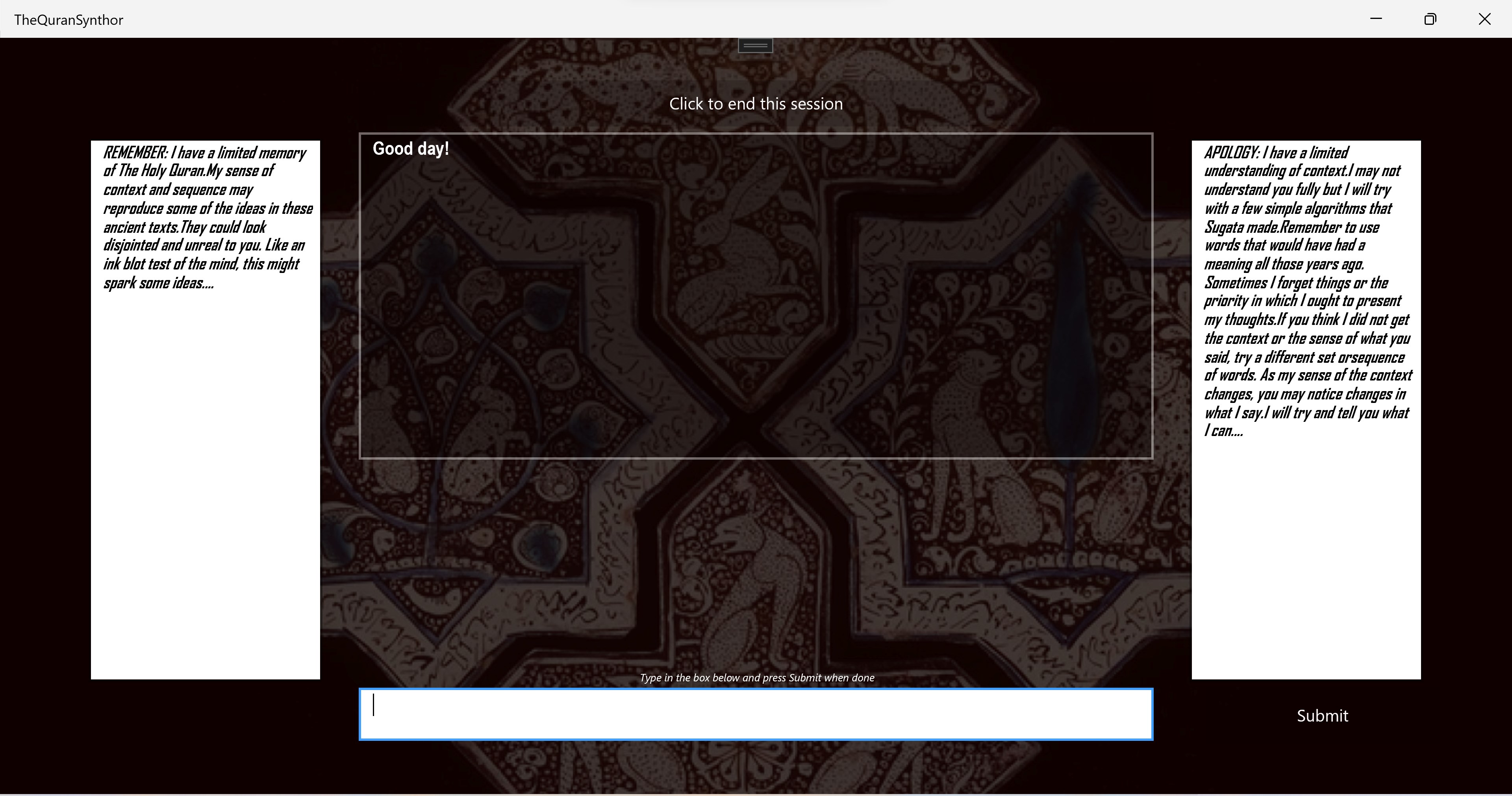 The Quran shapes the beliefs and attitudes of billions of people, but are not often completely read. The references come from others, who heard it from yet others....like in a Chinese Whisper. This Synthor can tell you what is actually written in these ancient and timeless texts. Not one word will be added or changed.