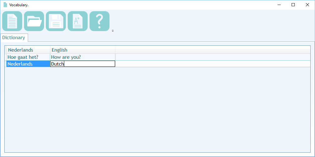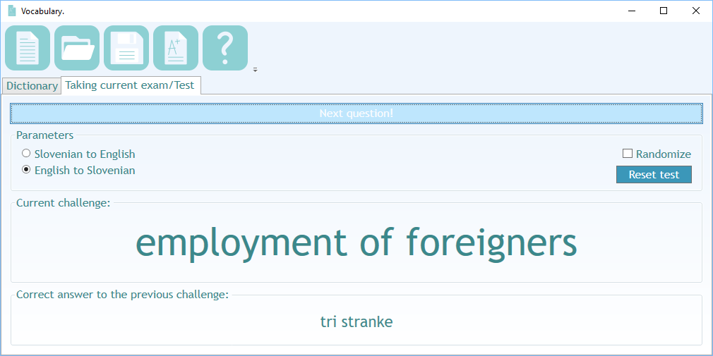 Define and input a vocabulary list or open a previously saved oneQuestion yourself from native to new language – and vice-versa using the exam/test functionRandomize tests for added difficultyAble to execute from associated *.vocab file