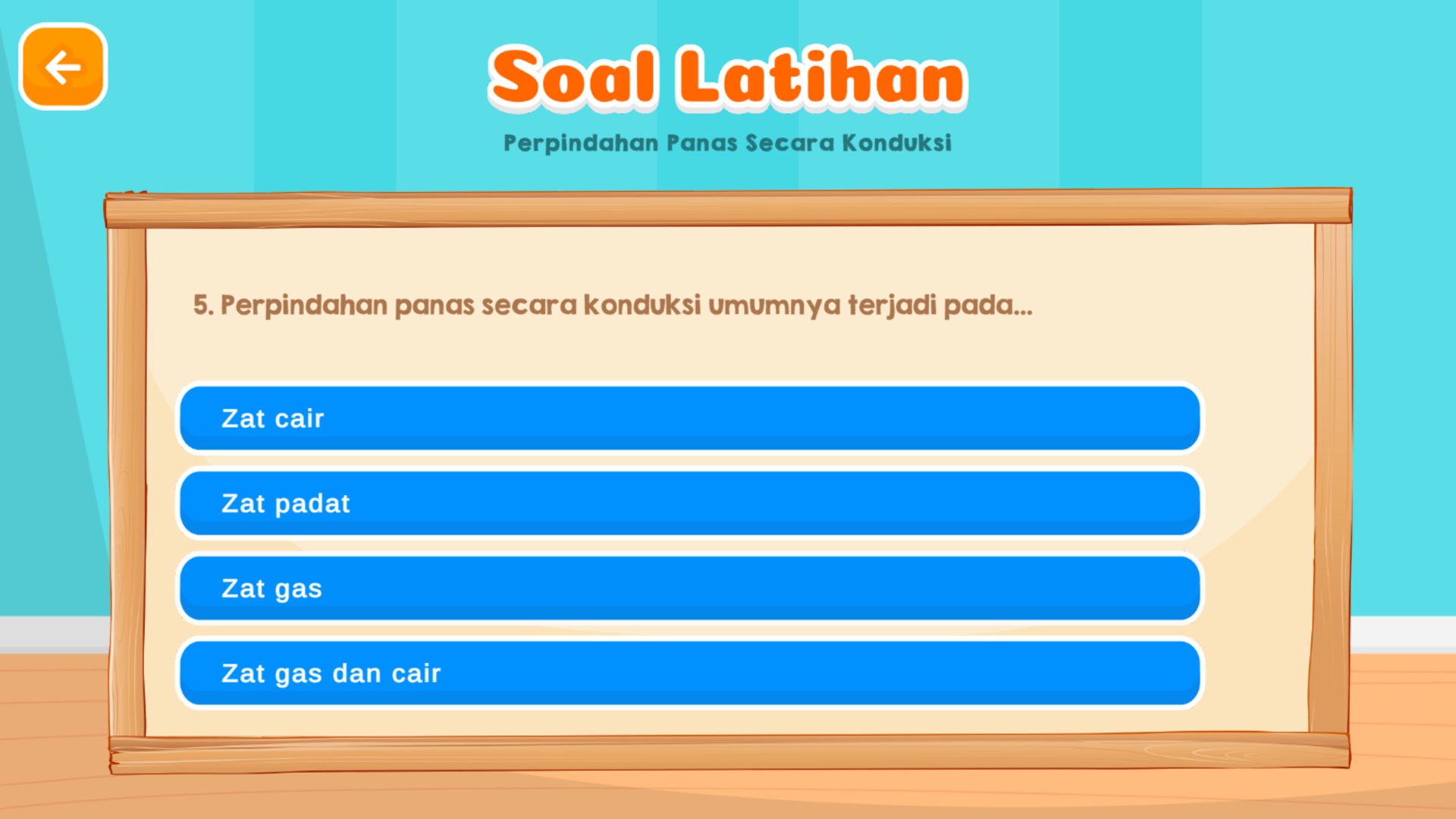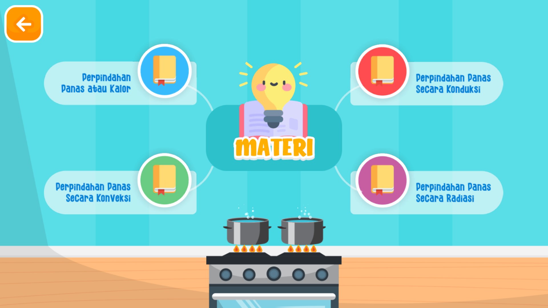Materi-materi tersebut disajikan secara menarik dan interaktif, tidak hanya disajikan dalam bentuk slide tapi juga terdapat simulasi sederhana contoh perpindahan panas pecara konduksi, konveksi, dan radiasi dalam kehidupan sehari hari