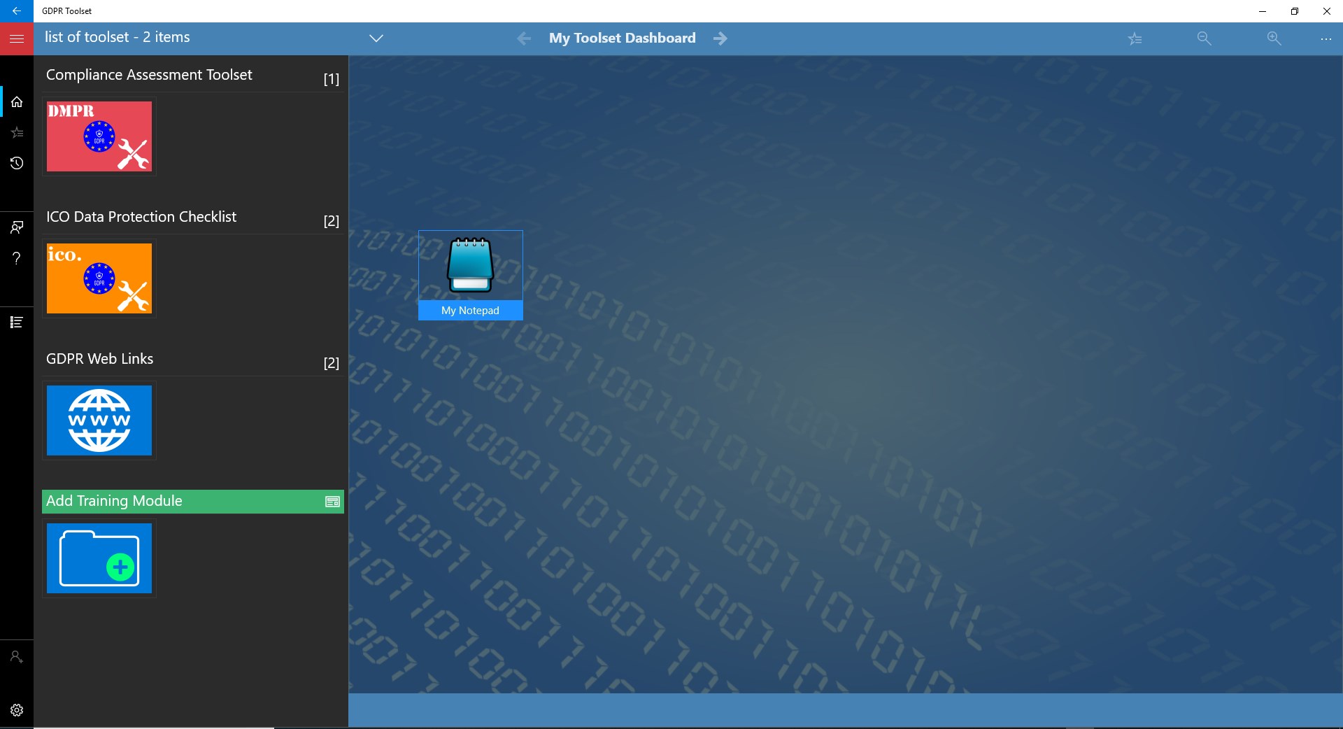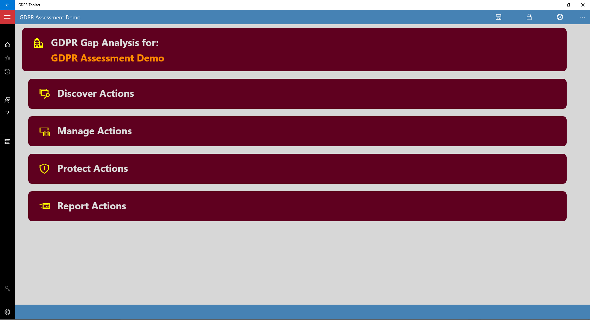Project-based UI for creating GDPR compliance assessments with settings to tailor each project to a customer;Tree-view based navigation that is consistent with the DMPR themes and for ultimate ease for editing and navigating assessment data;A statistical summary page for each project with color charting that aids results visibility at a glance, with an indication of percentage completion of various assessment categories;The powerhouse of the GDPR Toolset app—Automatic Report Generation (ARG) synthesizes all the assessment information of a project and turns into a Microsoft Word document;Built-in demo project to highlight the features and capabilities of GDPR Toolset in the shortest time possible;A link to an official GDPR Web Portal as a reference resource and based on an integrated web browser within the app, and side by-side with your assessment projects;An alternative GDPR resource link to Intersoft website: this provides well-structured and indexed GDPR Articles with improved navigation and keyword search;Built-in password security as standard for extra layer of security at the App level. Where more stringent data security is desirable, full data encryption supported with add-on optional product.