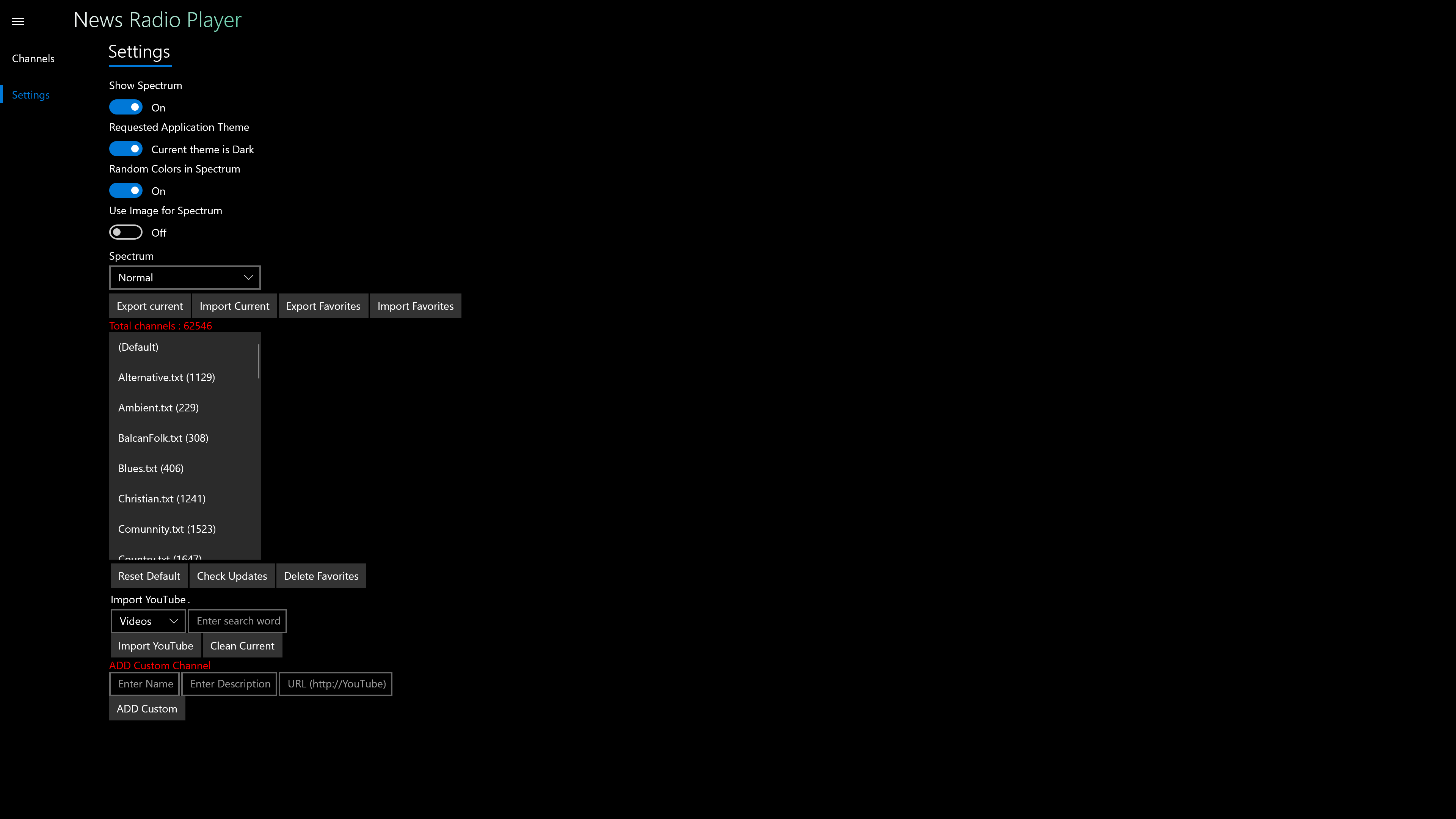Added Custom channel under settings to merge with current station list. (Supports also YouTube).