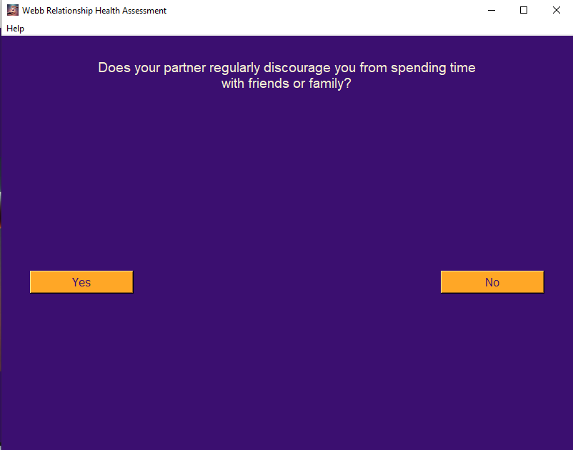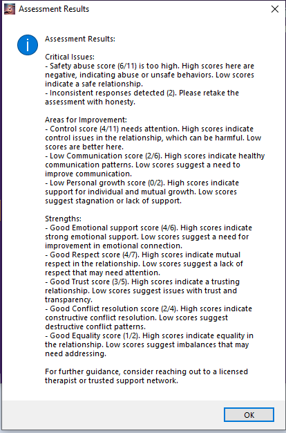 Comprehensive Evaluation: Assess key relationship factors, including emotional support, communication, trust, respect, conflict resolution, and equality.Tailored Feedback: Receive insights on your relationship\'s strengths, areas for improvement, and critical concerns.Helpful Resources: Access curated resources for emotional support, safety, and relationship guidance.Simple and Interactive: Answer a series of straightforward questions in an engaging and user-friendly interface.Restart Anytime: Retake the assessment as often as needed to track progress and growth in your relationship.