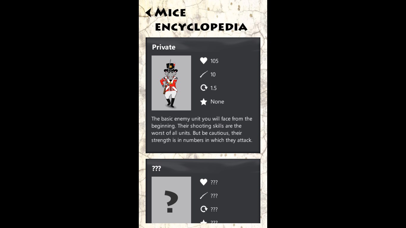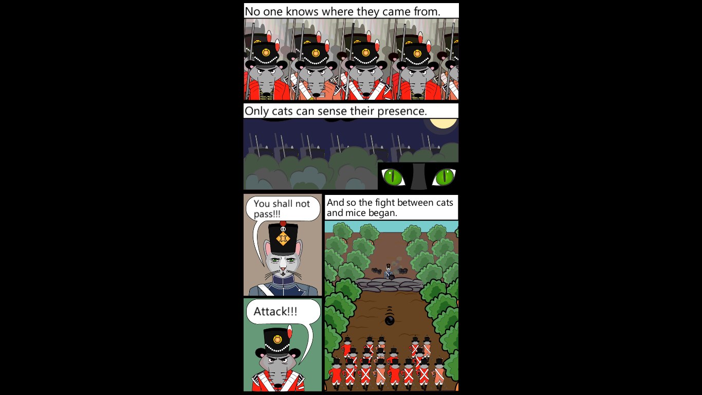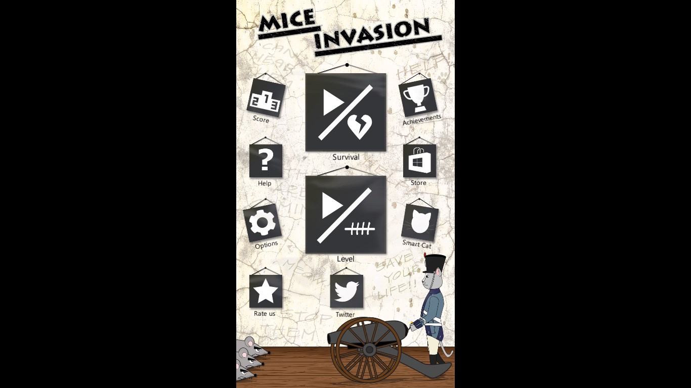 Game principle is easy. A cat with a gun is placed in the lower part of a screen, you move sideways with a gun by tilting a mobile device and shoot by tapping on the screen. Mice are going from the top of the screen, every now and then they stop, aim and shoot. Each received shot lowers cat’s determination to protect the farm as well as every mouse slipping through its barricade. When the determination reaches zero, game ends; but don't worry, you can try it again.