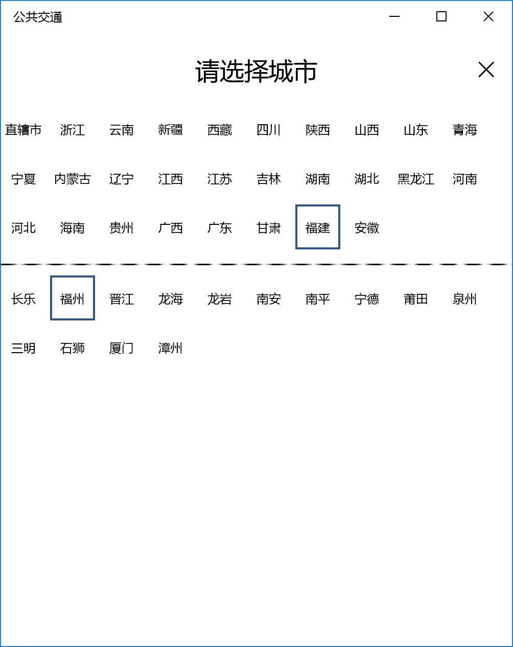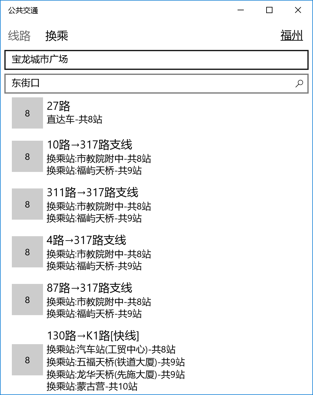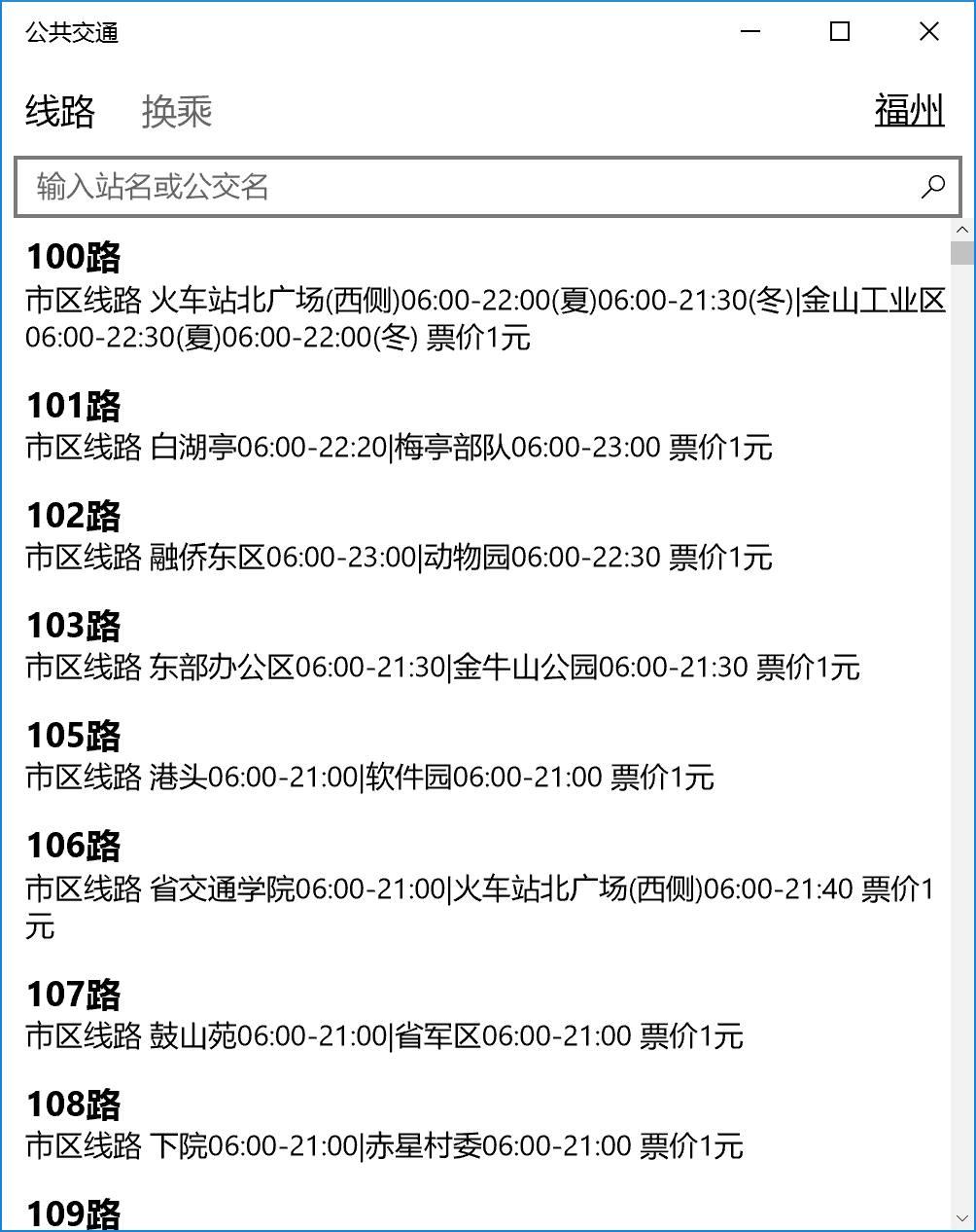 说明:公共交通原名公交路线查询,由于开发平台存在bug,无法在原有应用上进行更新,故全新开发Windows通用应用公共交通,第一个版本实现了原应用大部分功能,并且去除了数据加密,后续会允许大家自行更新或者修改数据。