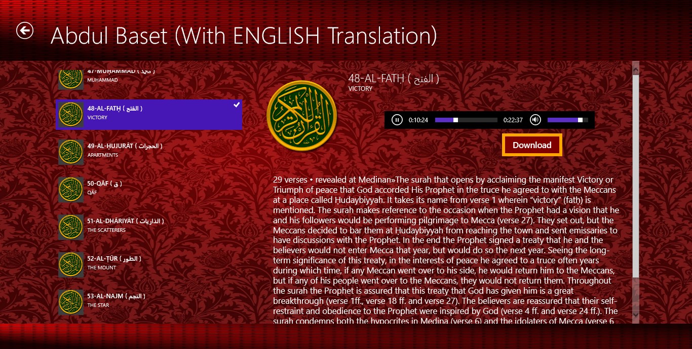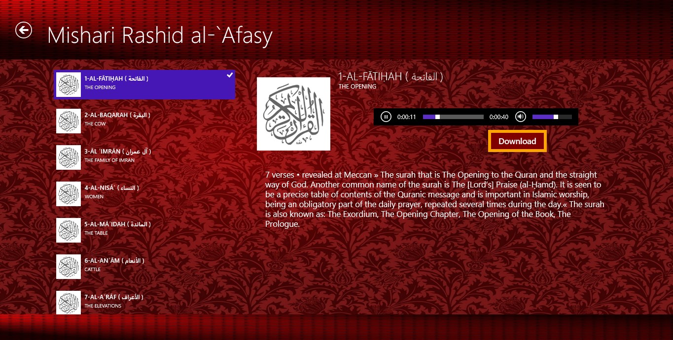 Moreover the best feature is the access to download any listed Surah which can also be played later in offline mode.