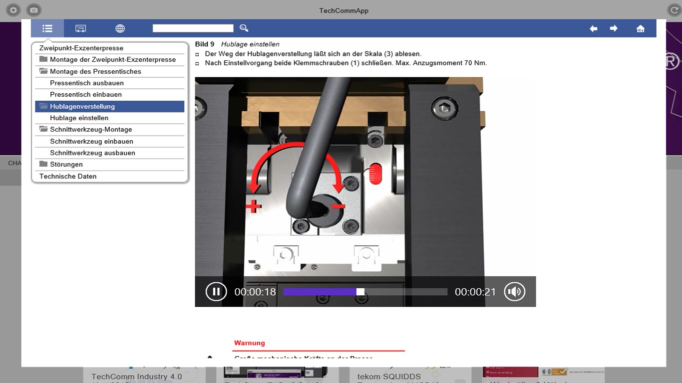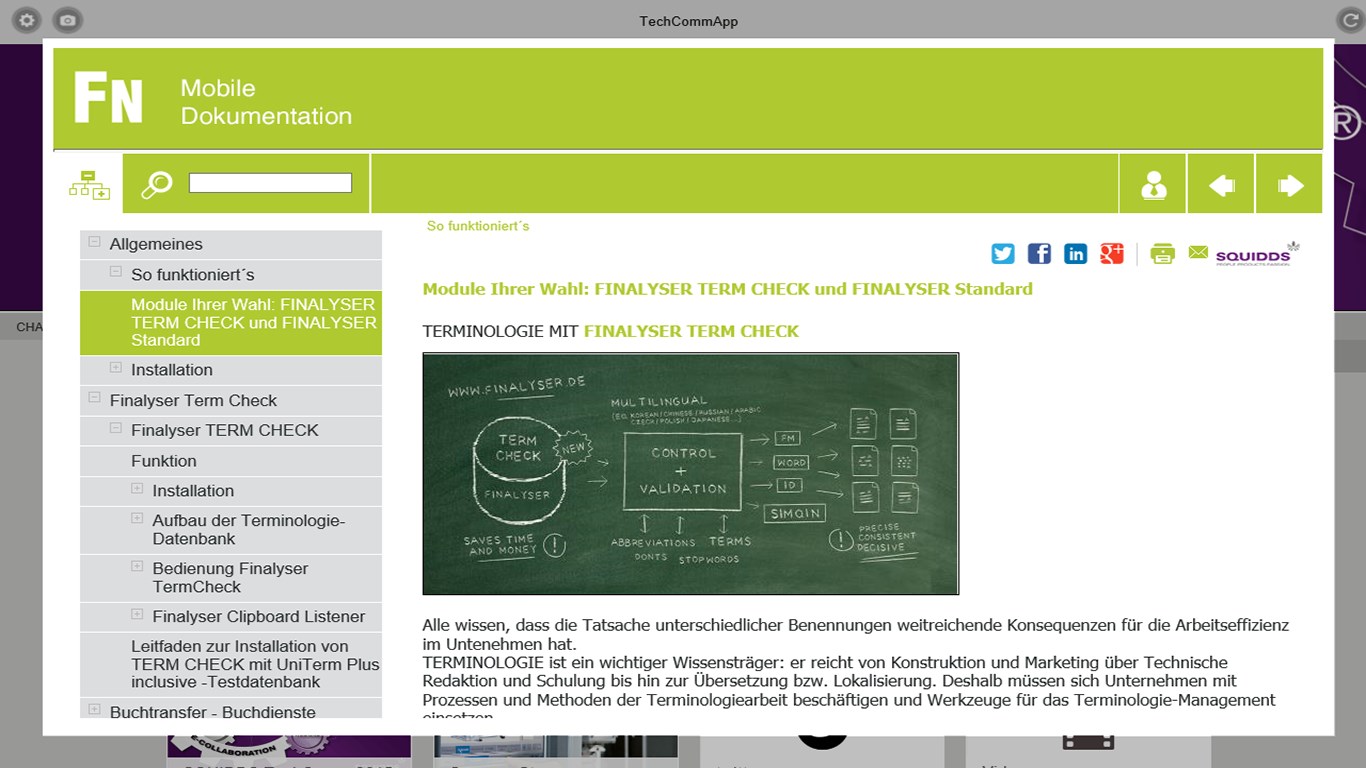 The SQUIDDS TechComm App offers a platform to provide mobile documentation, included RichMedia Data like 3D, Video, PDF and Audio, just as Social Media compontents like Twitter, Facebook in so called HTML5 responsive (Reverb) -container. With this App the user is able to use manuals online and offline. The distinction in Public and Private Documents allows access control for specific manuals and the providing of public documentation.