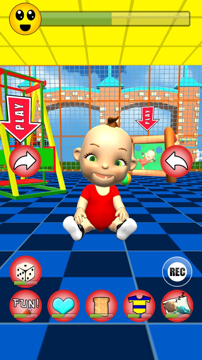 Meet Babsy the talking baby at the mall playground. Talk with her and she will repeat everything you say and respond to your touch. Spend a great time with Babsy and her joyful activities. Make her play with the different playground equipment, like the slide, the cool swing, the cool seesaw (teeter totter), the tunnel etc.