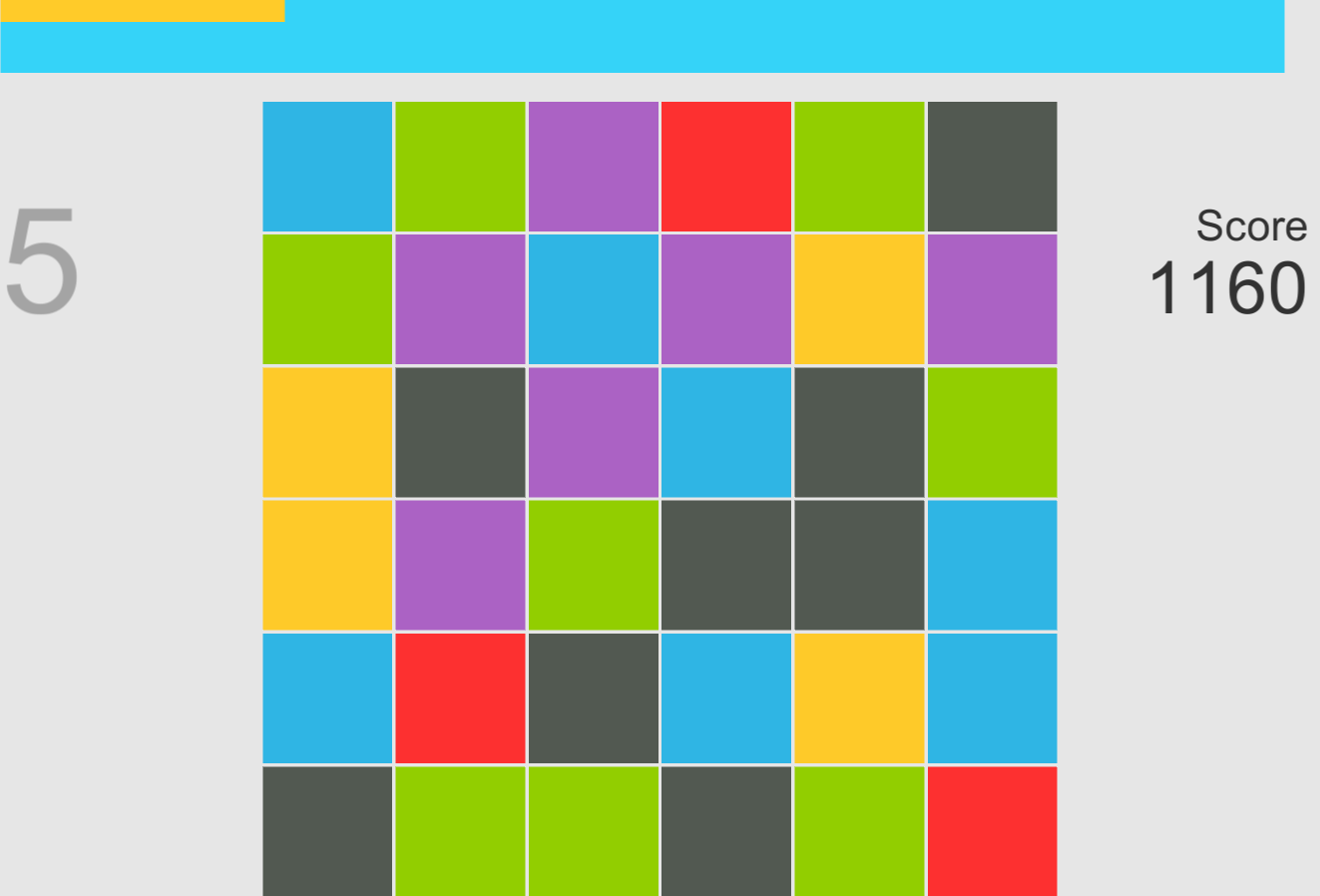 Dragging squares on the board vertically or horizontally, making more than 3 squares of the same color in a line to get points. Watch out the limited time.