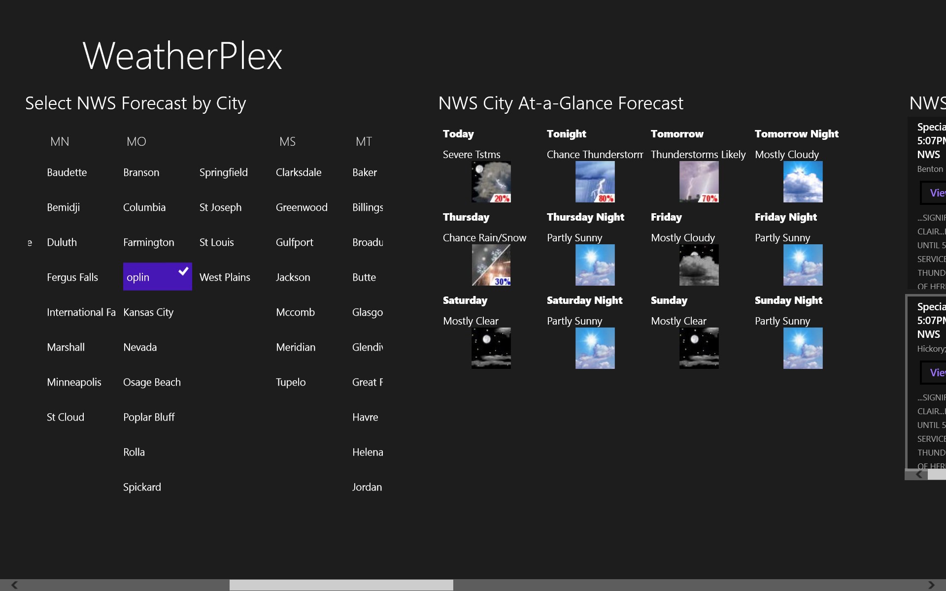Listen to NWS "All Hazards" Radio (for available stations as streamed by WeatherUnderground).Radio is fully suppored in the \'background\' - work on other things while listening to a broadcast.Select \'At-a-Glance\' forecasts from 495 locations acrosss the U.S., Guam, Puerto Rico and the U.S. Virgin Islands.View NWS-issued weather alerts for a selected state.Customizable weather map with point-forecasts and queryable map features.